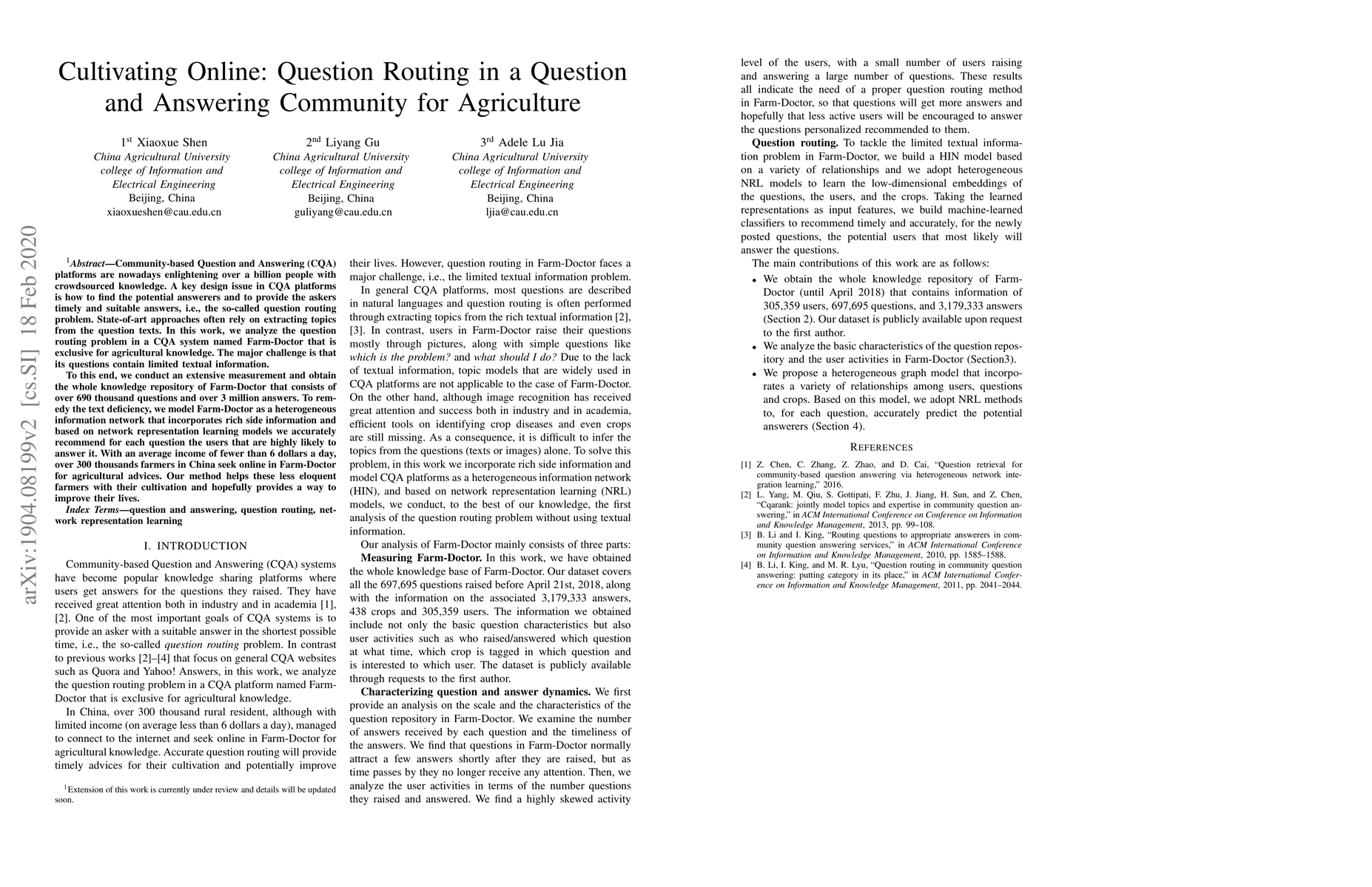 This paper investigates the question routing problem in the Farm-Doctor CQA platform, which specializes in agricultural knowledge. It models the platform as a heterogeneous information network to address the text deficiency in questions, employing network representation learning to recommend suitable answerers. The approach aims to assist low-income farmers in China by providing timely and accurate agricultural advice.