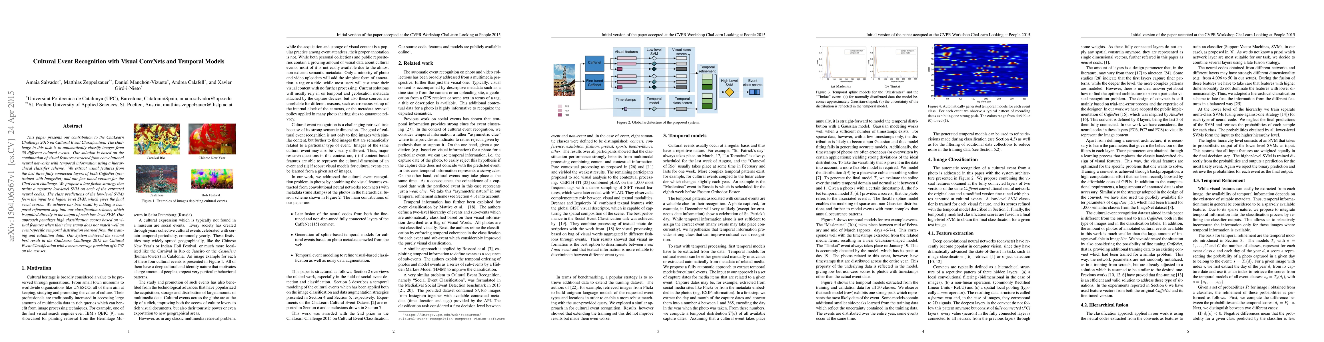 This paper presents our contribution to the ChaLearn Challenge 2015 on Cultural Event Classification. The challenge in this task is to automatically classify images from 50 different cultural events. Our solution is based on the combination of visual features extracted from convolutional neural networks with temporal information using a hierarchical classifier scheme. We extract visual features from the last three fully connected layers of both CaffeNet (pretrained with ImageNet) and our fine tuned version for the ChaLearn challenge. We propose a late fusion strategy that trains a separate low-level SVM on each of the extracted neural codes. The class predictions of the low-level SVMs form the input to a higher level SVM, which gives the final event scores. We achieve our best result by adding a temporal refinement step into our classification scheme, which is applied directly to the output of each low-level SVM. Our approach penalizes high classification scores based on visual features when their time stamp does not match well an event-specific temporal distribution learned from the training and validation data. Our system achieved the second best result in the ChaLearn Challenge 2015 on Cultural Event Classification with a mean average precision of 0.767 on the test set.