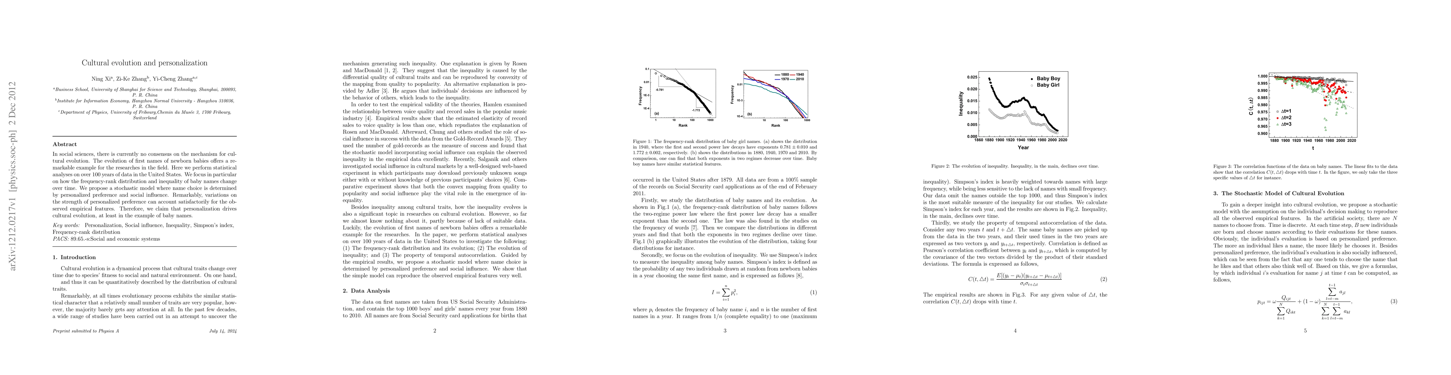 This paper investigates the cultural evolution of first names in the U.S. over a century, proposing a stochastic model that explains changes in name frequency and inequality driven by personalized preference and social influence, suggesting personalization as a key factor in cultural evolution.