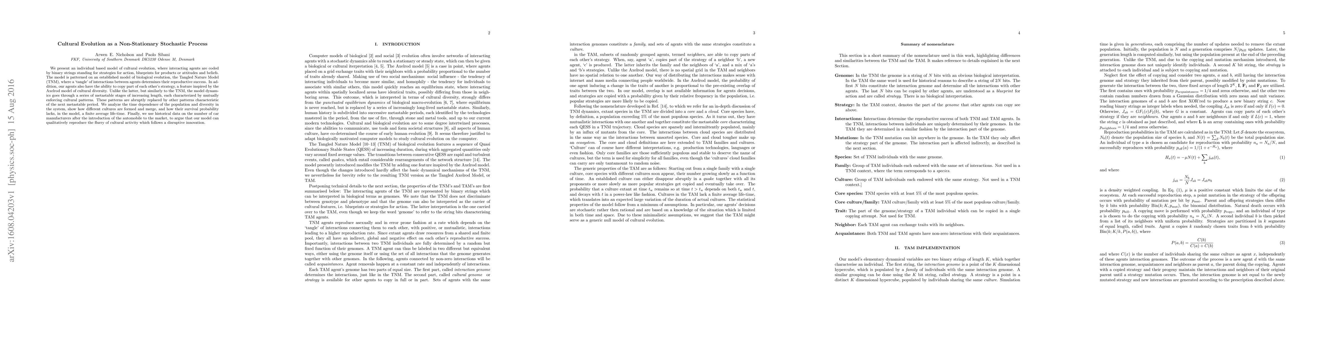 We present an individual based model of cultural evolution, where interacting agents are coded by binary strings standing for strategies for action, blueprints for products or attitudes and beliefs. The model is patterned on an established model of biological evolution, the Tangled Nature Model (TNM), where a `tangle' of interactions between agents determines their reproductive success. In addition, our agents also have the ability to copy part of each other's strategy, a feature inspired by the Axelrod model of cultural diversity. Unlike the latter, but similarly to the TNM, the model dynamics goes through a series of metastable stages of increasing length, each characterized by mutually enforcing cultural patterns. These patterns are abruptly replaced by other patterns characteristic of the next metastable period. We analyze the time dependence of the population and diversity in the system, show how different cultures are formed and merge, and how their survival probability lacks, in the model, a finite average life-time. Finally, we use historical data on the number of car manufacturers after the introduction of the automobile to the market, to argue that ourmodel can qualitatively reproduce the flurry of cultural activity which follows a disruptive innovation.