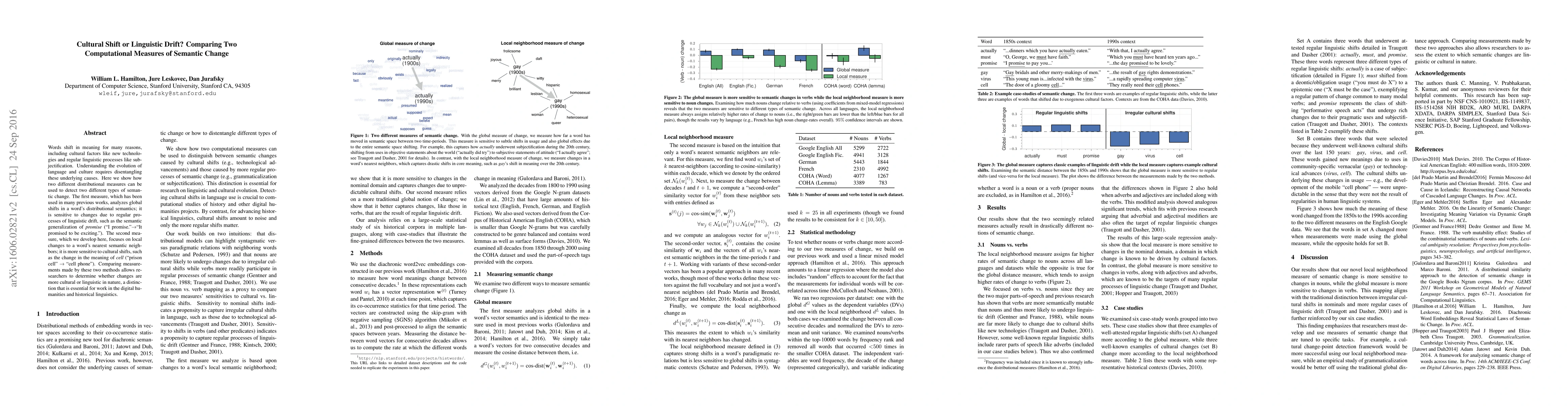 This paper introduces two computational methods to distinguish between cultural and linguistic causes of semantic change in words. The first method, globally analyzing shifts in a word's meaning, detects regular linguistic drift, while the second, focusing on local changes to a word's semantic neighbors, identifies cultural shifts. These methods help researchers differentiate between cultural influences (e.g., 'cell' from 'prison cell' to 'cell phone') and linguistic processes (e.g., 'promise' broadening from personal commitment to general assurance).
