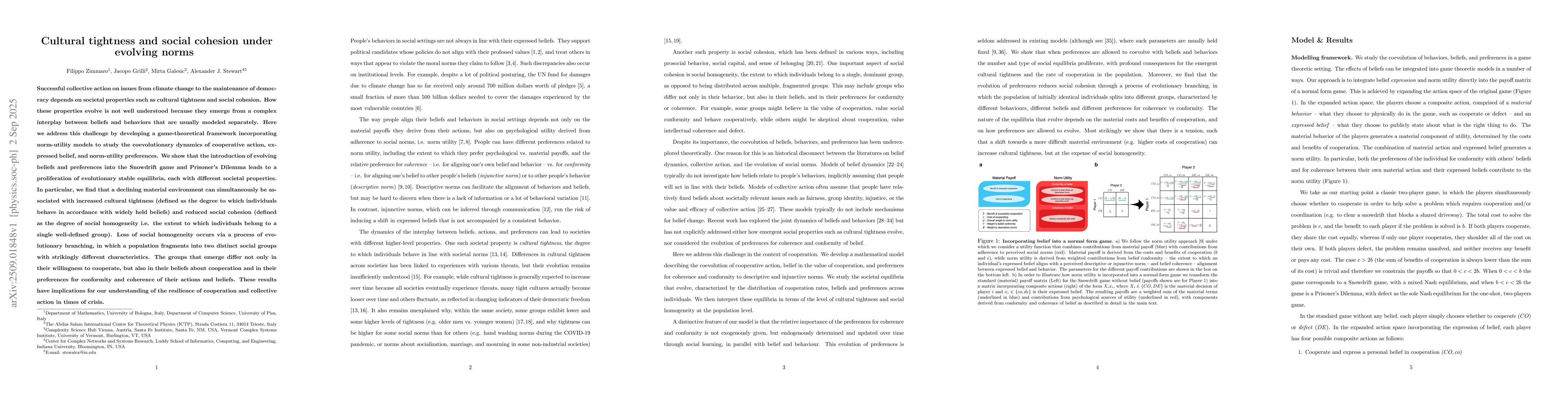 Successful collective action on issues from climate change to the maintenance of democracy depends on societal properties such as cultural tightness and social cohesion. How these properties evolve is not well understood because they emerge from a complex interplay between beliefs and behaviors that are usually modeled separately. Here we address this challenge by developing a game-theoretical framework incorporating norm-utility models to study the coevolutionary dynamics of cooperative action, expressed belief, and norm-utility preferences. We show that the introduction of evolving beliefs and preferences into the Snowdrift game and Prisoner's Dilemma leads to a proliferation of evolutionary stable equilibria, each with different societal properties. In particular, we find that a declining material environment can simultaneously be associated with increased cultural tightness (defined as the degree to which individuals behave in accordance with widely held beliefs) and reduced social cohesion (defined as the degree of social homogeneity i.e. the extent to which individuals belong to a single well-defined group). Loss of social homogeneity occurs via a process of evolutionary branching, in which a population fragments into two distinct social groups with strikingly different characteristics. The groups that emerge differ not only in their willingness to cooperate, but also in their beliefs about cooperation and in their preferences for conformity and coherence of their actions and beliefs. These results have implications for our understanding of the resilience of cooperation and collective action in times of crisis.