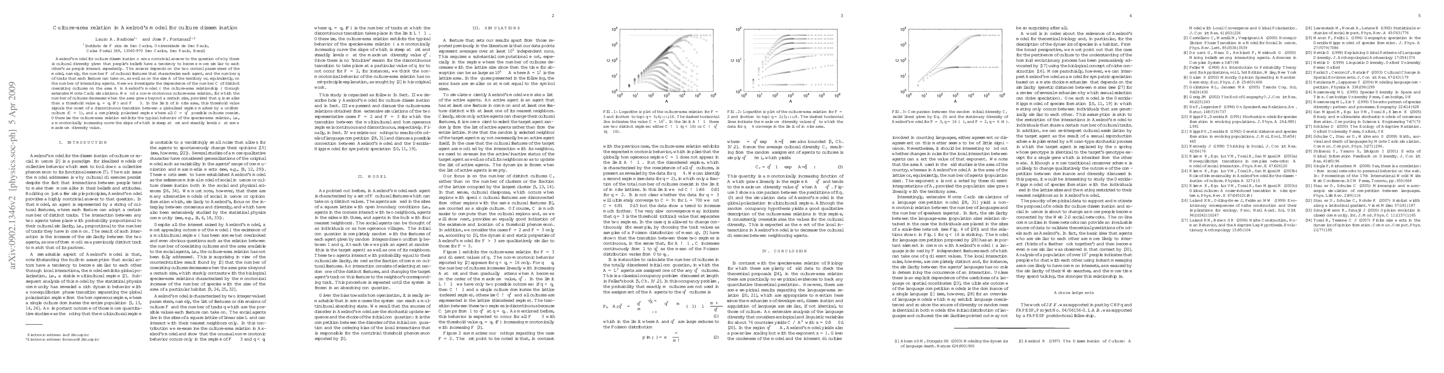 This paper explores the culture-area relationship in Axelrod's model for culture dissemination, revealing a non-monotonic relation where culture diversity decreases beyond a certain area size when specific parameters are met. The study finds a threshold value signaling a transition between uniform and polarized cultural regimes.