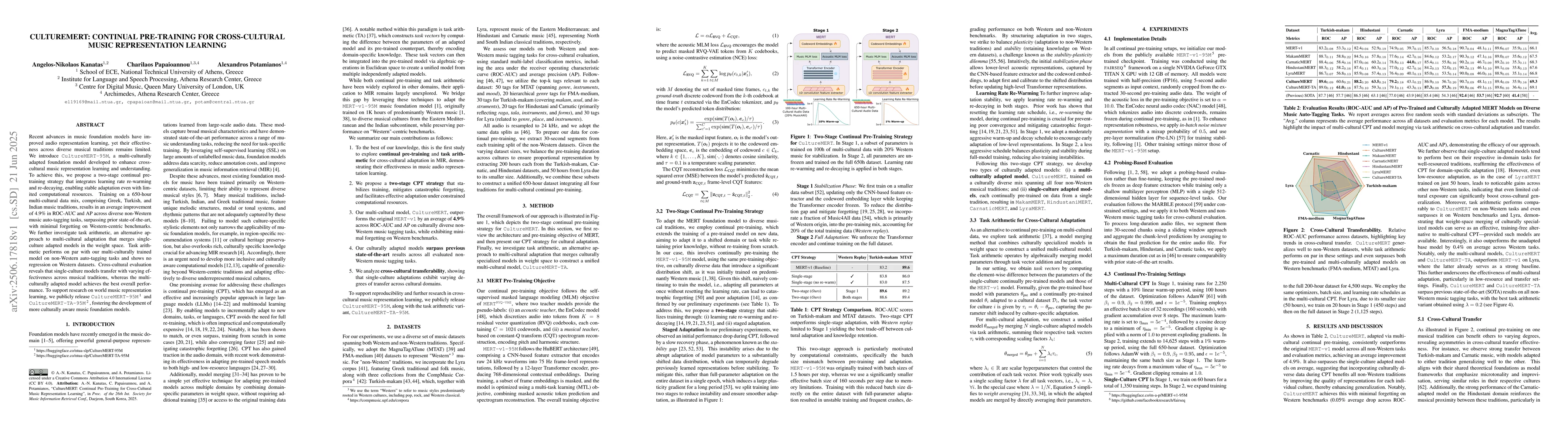 Recent advances in music foundation models have improved audio representation learning, yet their effectiveness across diverse musical traditions remains limited. We introduce CultureMERT-95M, a multi-culturally adapted foundation model developed to enhance cross-cultural music representation learning and understanding. To achieve this, we propose a two-stage continual pre-training strategy that integrates learning rate re-warming and re-decaying, enabling stable adaptation even with limited computational resources. Training on a 650-hour multi-cultural data mix, comprising Greek, Turkish, and Indian music traditions, results in an average improvement of 4.9% in ROC-AUC and AP across diverse non-Western music auto-tagging tasks, surpassing prior state-of-the-art, with minimal forgetting on Western-centric benchmarks. We further investigate task arithmetic, an alternative approach to multi-cultural adaptation that merges single-culture adapted models in the weight space. Task arithmetic performs on par with our multi-culturally trained model on non-Western auto-tagging tasks and shows no regression on Western datasets. Cross-cultural evaluation reveals that single-culture models transfer with varying effectiveness across musical traditions, whereas the multi-culturally adapted model achieves the best overall performance. To support research on world music representation learning, we publicly release CultureMERT-95M and CultureMERT-TA-95M, fostering the development of more culturally aware music foundation models.