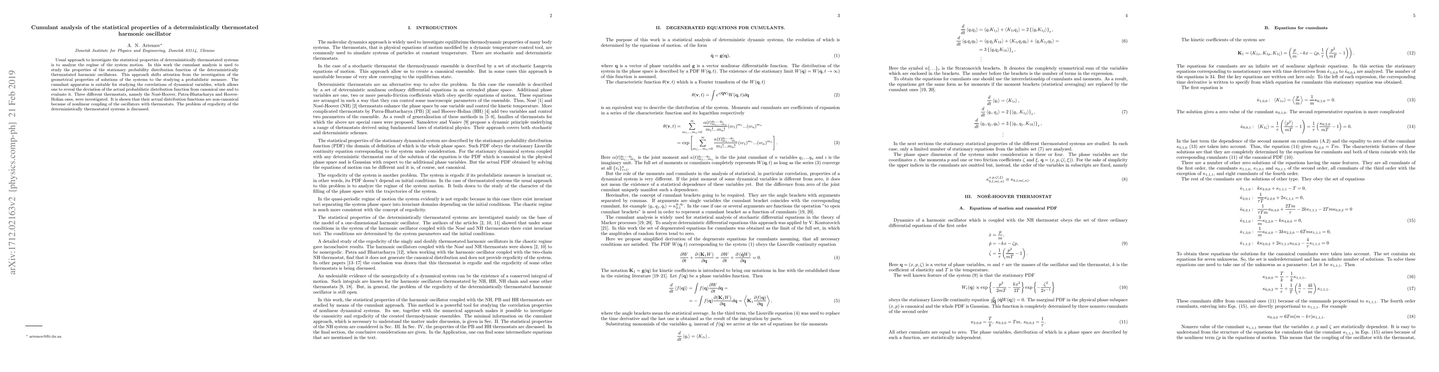 This paper employs cumulant analysis to investigate the statistical properties of deterministically thermostated harmonic oscillators, revealing that their stationary probability distributions deviate from the canonical distribution due to nonlinear coupling with different thermostats. The study discusses the ergodicity problem of these systems.