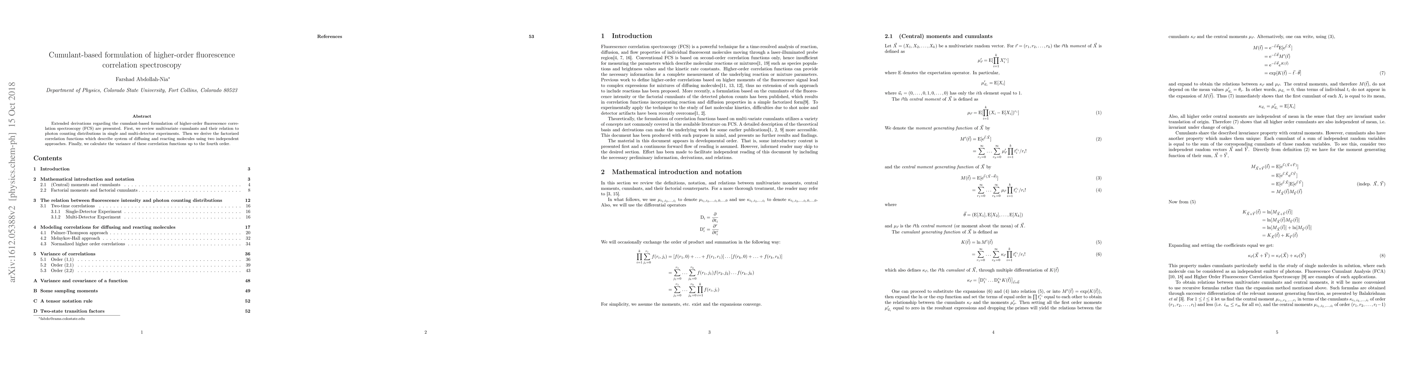 Extended derivations regarding the cumulant-based formulation of higher-order fluorescence correlation spectroscopy (FCS) are presented. First, we review multivariate cumulants and their relation to photon counting distributions in single and multi-detector experiments. Then we derive the factorized correlation functions which describe system of diffusing and reacting molecules using two independent approaches. Finally, we calculate the variance of these correlation functions up to the fourth order.