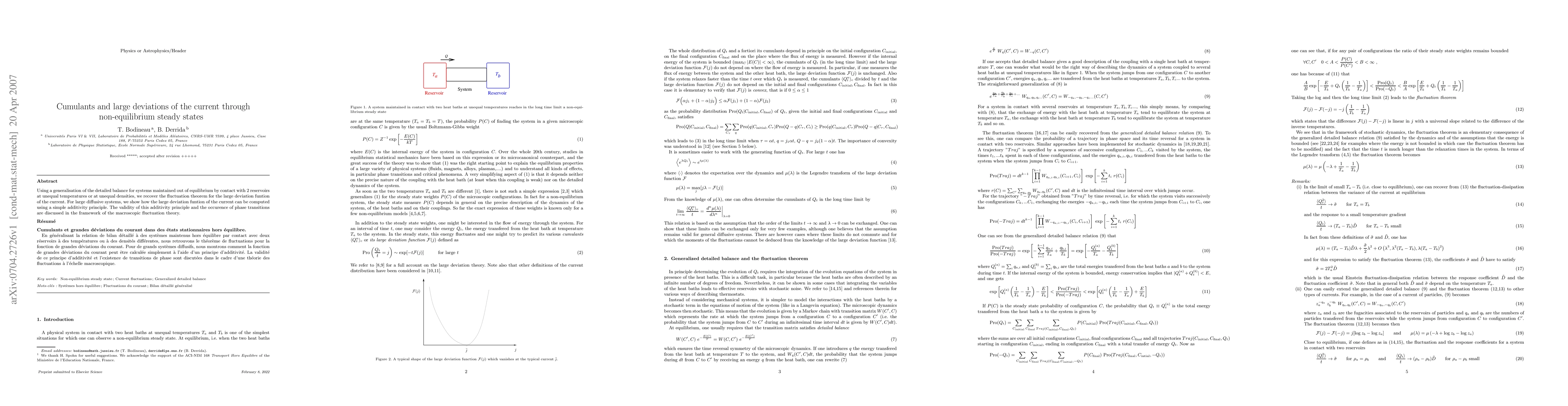 Using a generalisation of the detailed balance for systems maintained out of equilibrium by contact with 2 reservoirs at unequal temperatures or at unequal densities, we recover the fluctuation theorem for the large deviation funtion of the current. For large diffusive systems, we show how the large deviation funtion of the current can be computed using a simple additivity principle. The validity of this additivity principle and the occurence of phase transitions are discussed in the framework of the macroscopic fluctuation theory.