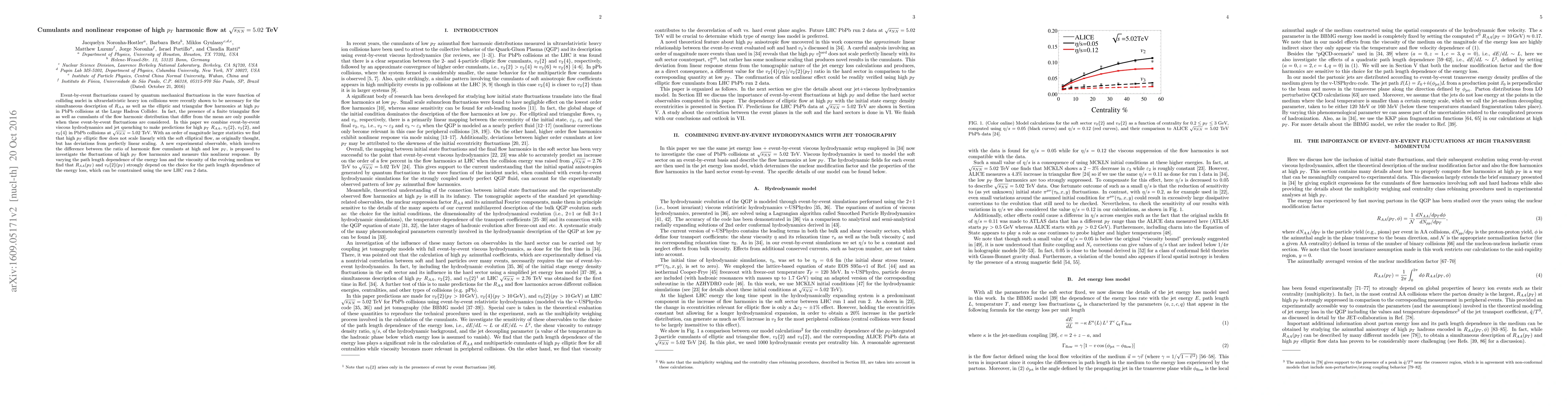 Event-by-event fluctuations caused by quantum mechanical fluctuations in the wave function of colliding nuclei in ultrarelativistic heavy ion collisions were recently shown to be necessary for the simultaneous description of $R_{AA}$ as well as the elliptic and triangular flow harmonics at high $p_T$ in PbPb collisions at the Large Hadron Collider. In fact, the presence of a finite triangular flow as well as cumulants of the flow harmonic distribution that differ from the mean are only possible when these event-by-event fluctuations are considered. In this paper we combine event-by-event viscous hydrodynamics and jet quenching to make predictions for high $p_T$ $R_{AA}$, $v_2\{2\}$, $v_3\{2\}$, and $v_2\{4\}$ in PbPb collisions at $\sqrt{s_{NN}}=5.02$ TeV. With an order of magnitude larger statistics we find that high $p_T$ elliptic flow does not scale linearly with the soft elliptical flow, as originally thought, but has deviations from perfectly linear scaling. A new experimental observable, which involves the difference between the ratio of harmonic flow cumulants at high and low $p_T$, is proposed to investigate the fluctuations of high $p_T$ flow harmonics and measure this nonlinear response. By varying the path length dependence of the energy loss and the viscosity of the evolving medium we find that $R_{AA}(p_T)$ and $v_2\{2\}(p_T)$ strongly depend on the choice for the path length dependence of the energy loss, which can be constrained using the new LHC run 2 data.