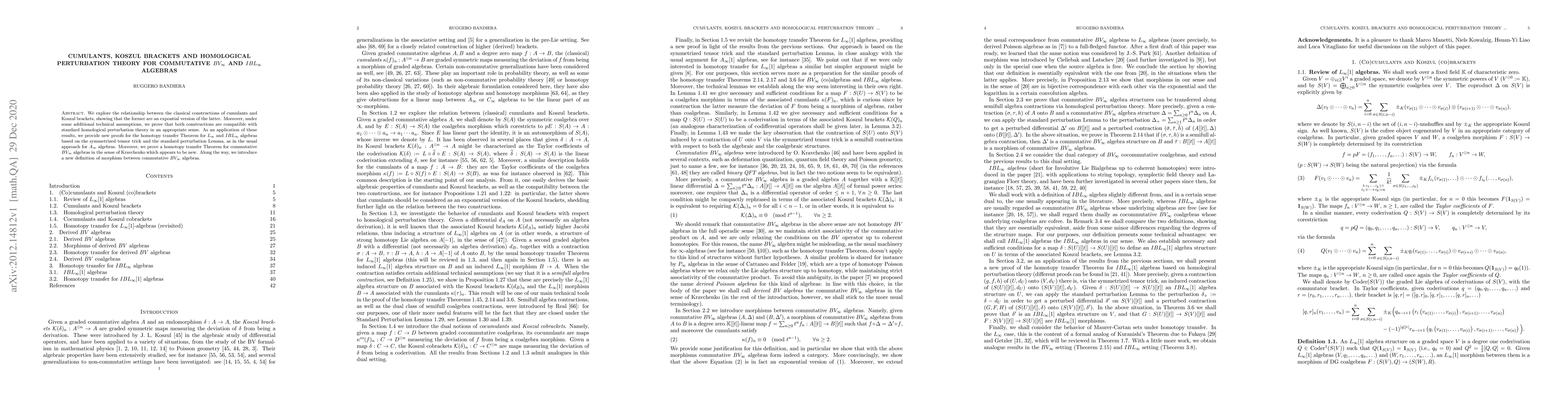 This paper establishes a connection between cumulants and Koszul brackets, demonstrating that cumulants are an exponential version of Koszul brackets. It also shows compatibility of these constructions with homological perturbation theory, leading to new proofs for homotopy transfer theorems in $L_\infty$ and $IBL_\infty$ algebras, and a novel homotopy transfer theorem for commutative $BV_\infty$ algebras.