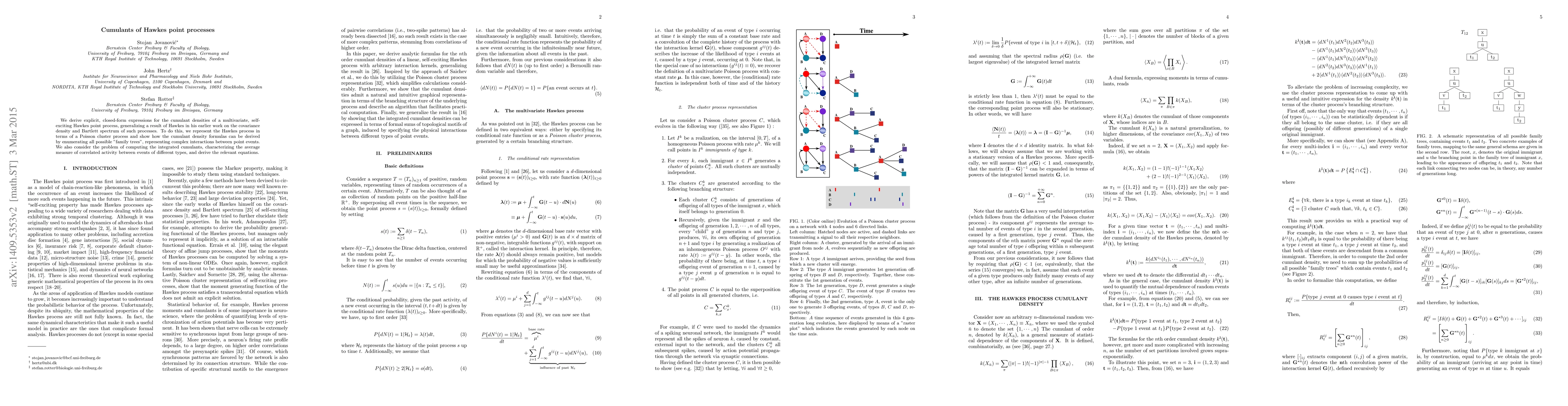 This paper derives closed-form expressions for the cumulant densities of a multivariate Hawkes point process, representing the process via a Poisson cluster and enumerating interaction "family trees." It also addresses the computation of integrated cumulants to characterize correlated activity between different event types.