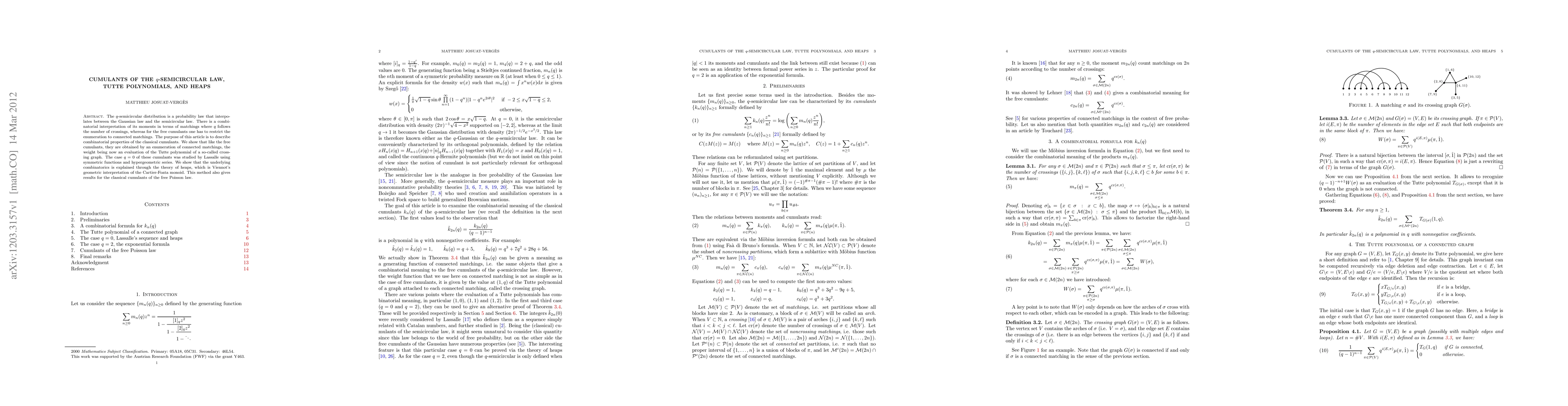 This paper explores the combinatorial properties of the classical cumulants in the context of the q-semicircular law, showing they arise from connected matchings weighted by Tutte polynomial evaluations. The study connects these cumulants to heaps, providing a geometric interpretation through Viennot's theory.