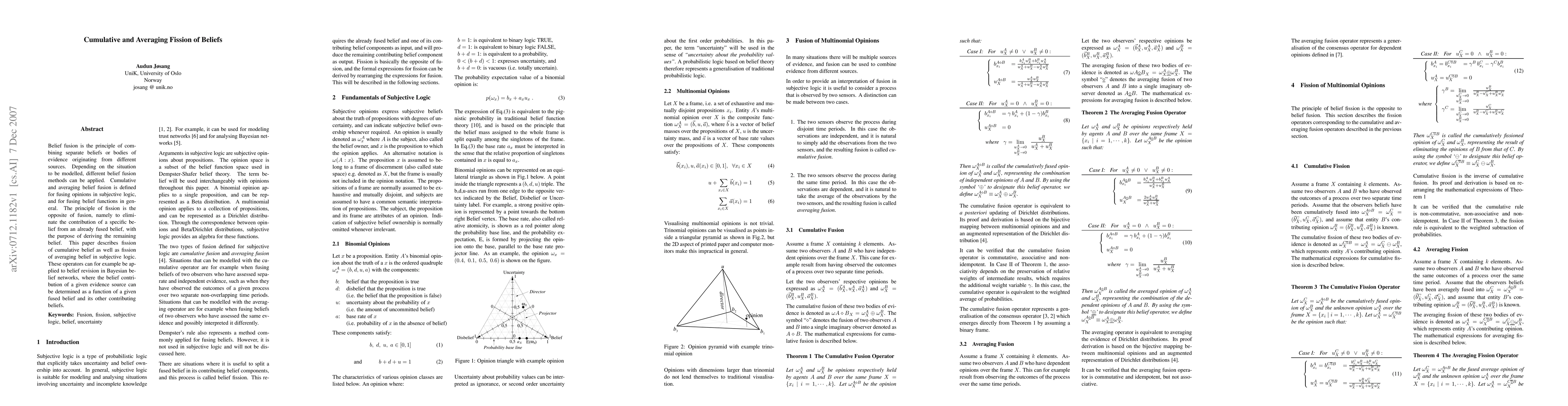 Belief fusion is the principle of combining separate beliefs or bodies of evidence originating from different sources. Depending on the situation to be modelled, different belief fusion methods can be applied. Cumulative and averaging belief fusion is defined for fusing opinions in subjective logic, and for fusing belief functions in general. The principle of fission is the opposite of fusion, namely to eliminate the contribution of a specific belief from an already fused belief, with the purpose of deriving the remaining belief. This paper describes fission of cumulative belief as well as fission of averaging belief in subjective logic. These operators can for example be applied to belief revision in Bayesian belief networks, where the belief contribution of a given evidence source can be determined as a function of a given fused belief and its other contributing beliefs.
