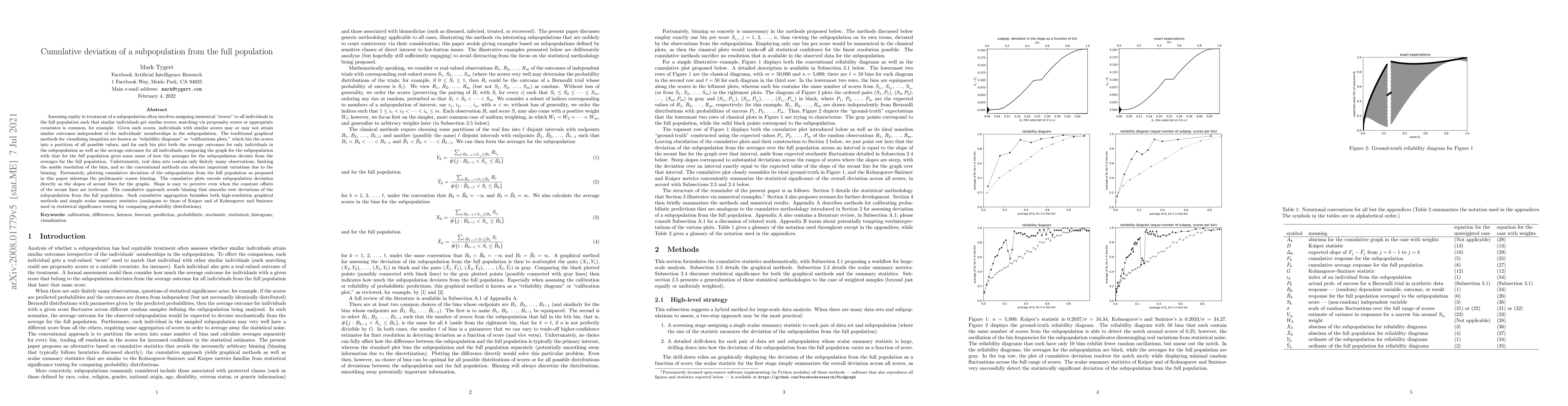 Assessing equity in treatment of a subpopulation often involves assigning numerical "scores" to all individuals in the full population such that similar individuals get similar scores; matching via propensity scores or appropriate covariates is common, for example. Given such scores, individuals with similar scores may or may not attain similar outcomes independent of the individuals' memberships in the subpopulation. The traditional graphical methods for visualizing inequities are known as "reliability diagrams" or "calibrations plots," which bin the scores into a partition of all possible values, and for each bin plot both the average outcomes for only individuals in the subpopulation as well as the average outcomes for all individuals; comparing the graph for the subpopulation with that for the full population gives some sense of how the averages for the subpopulation deviate from the averages for the full population. Unfortunately, real data sets contain only finitely many observations, limiting the usable resolution of the bins, and so the conventional methods can obscure important variations due to the binning. Fortunately, plotting cumulative deviation of the subpopulation from the full population as proposed in this paper sidesteps the problematic coarse binning. The cumulative plots encode subpopulation deviation directly as the slopes of secant lines for the graphs. Slope is easy to perceive even when the constant offsets of the secant lines are irrelevant. The cumulative approach avoids binning that smooths over deviations of the subpopulation from the full population. Such cumulative aggregation furnishes both high-resolution graphical methods and simple scalar summary statistics (analogous to those of Kuiper and of Kolmogorov and Smirnov used in statistical significance testing for comparing probability distributions).