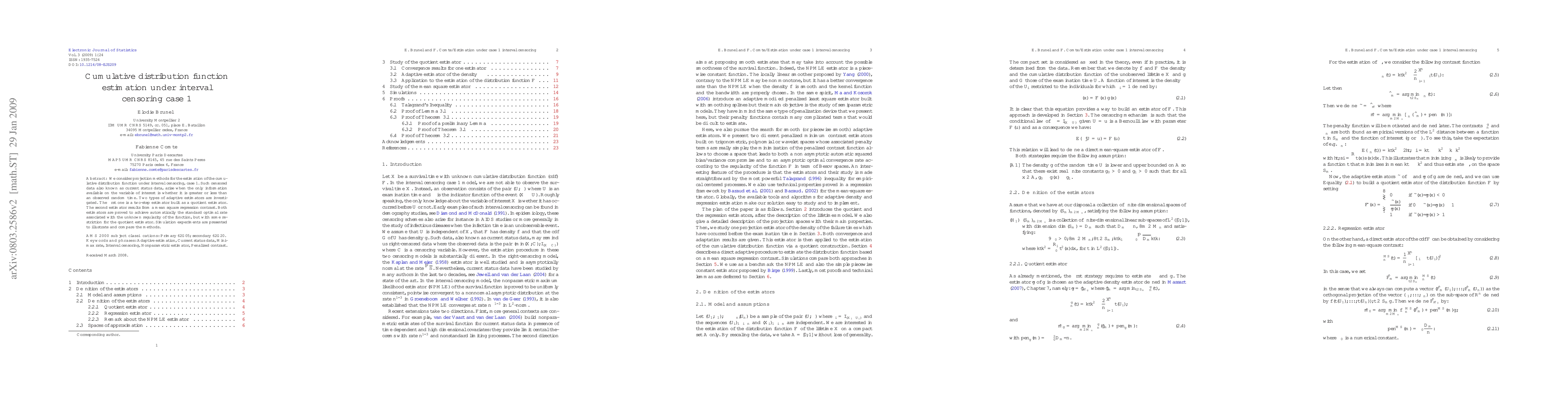 The paper investigates projection methods for estimating the cumulative distribution function under interval censoring, case 1, using adaptive estimators. These estimators include a two-step quotient estimator and one derived from mean square regression contrast.