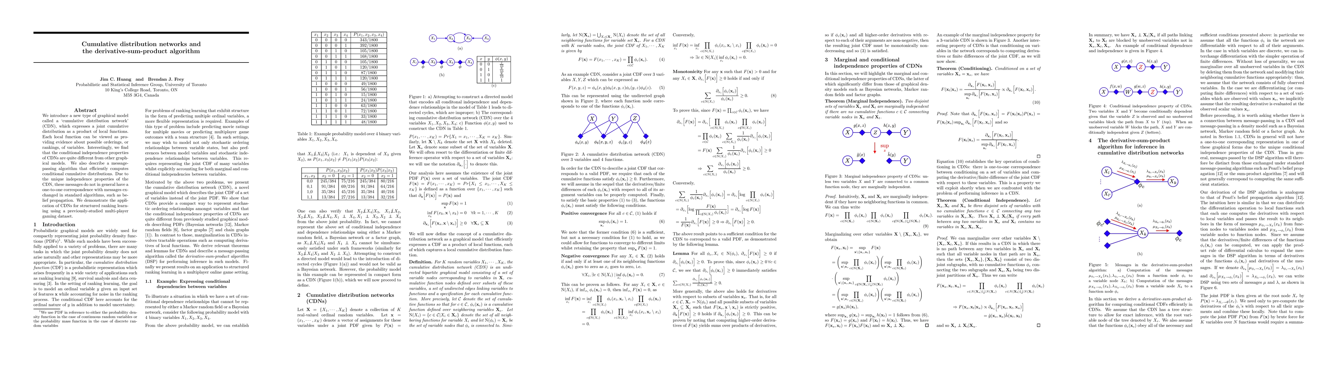 We introduce a new type of graphical model called a "cumulative distribution network" (CDN), which expresses a joint cumulative distribution as a product of local functions. Each local function can be viewed as providing evidence about possible orderings, or rankings, of variables. Interestingly, we find that the conditional independence properties of CDNs are quite different from other graphical models. We also describe a messagepassing algorithm that efficiently computes conditional cumulative distributions. Due to the unique independence properties of the CDN, these messages do not in general have a one-to-one correspondence with messages exchanged in standard algorithms, such as belief propagation. We demonstrate the application of CDNs for structured ranking learning using a previously-studied multi-player gaming dataset.