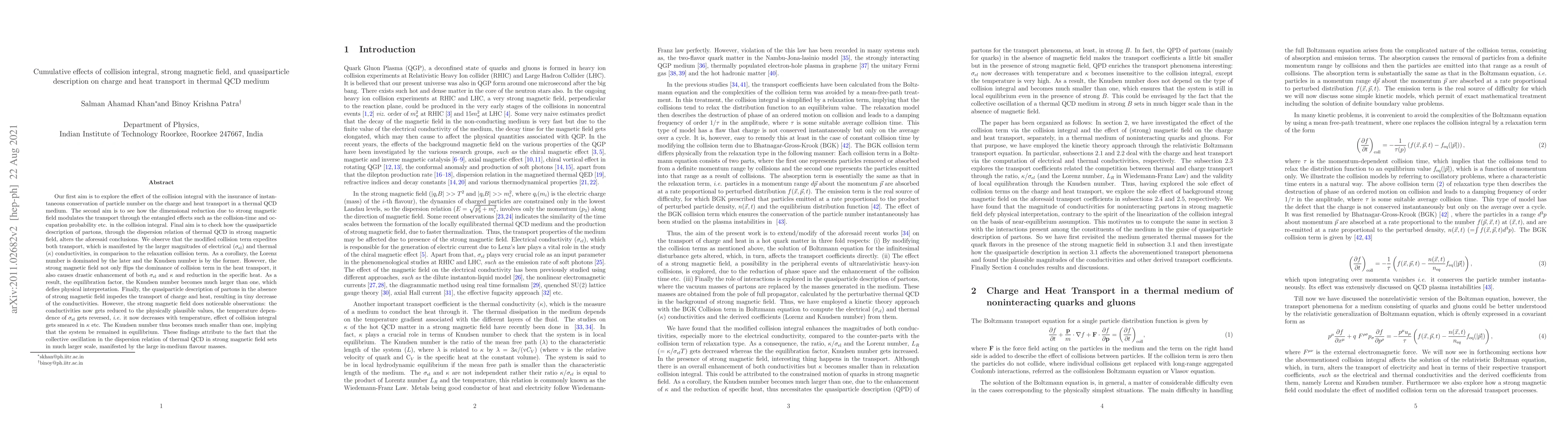 Our first aim is to explore the effect of the collision integral with the insurance of instantaneous conservation of particle number on charge and heat transport in a thermal QCD medium. The second aim is to see how the dimensional reduction due to strong magnetic field (B) modulates the transport through the entangled effects, {\em such as} collision-time and occupation probability etc. in collision integral. The final aim is to check how the quasiparticle description through dispersion relation of thermal QCD in strong B, alters the aforesaid conclusions. We observe that modified collision term expedites both transport, which is manifested by large magnitudes of electrical ($\sigma_{\rm el}$) and thermal ($\kappa$) conductivities, in comparison to relaxation-collision term. As a corollary, Lorenz number is dominated by the later and Knudsen number is by the former. However, strong B not only flips the dominance of collision term in heat transport, it also causes drastic enhancement of both $\sigma_{\rm el}$ and $\kappa$ and reduction in specific heat. As a result, the equilibration factor, Knudsen number becomes much larger than one, which defies physical interpretation. Finally, quasiparticle description in the absence of strong B impedes the transport of charge and heat, resulting in the meagre decrease of conductivities, however, strong B does noticeable observations: conductivities now gets reduced to physically plausible values, T-dependence of $\sigma_{\rm el}$ gets reversed, {\em i.e.} it now decreases with T, effect of collision integral gets smeared in $\kappa$ etc. Knudsen number thus becomes much smaller than one, implying that the system be remained in equilibrium. These findings attribute to the fact that the collective modes in the dispersion relation of thermal QCD in strong B sets in much larger scale, manifested by large in-medium masses.