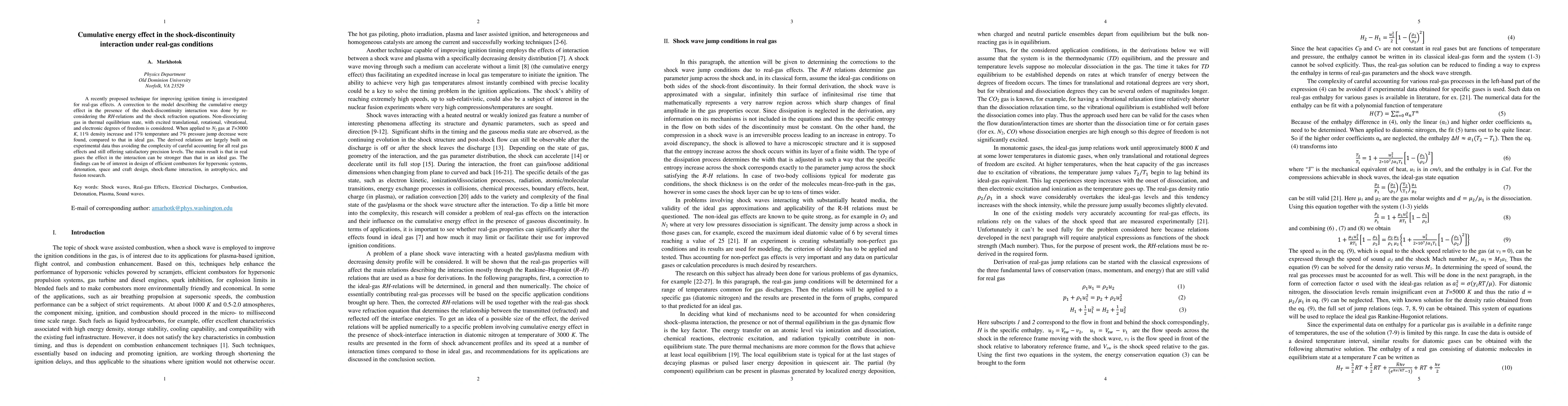 A recently proposed technique for improving ignition timing is investigated for real-gas effects. A correction to the model describing the cumulative energy effect in the presence of the shock-discontinuity interaction was done by re-considering the RH-relations and the shock refraction equations. Non-dissociating gas in thermal equilibrium state, with excited translational, rotational, vibrational, and electronic degrees of freedom is considered. When applied to N2 gas at T=3000 K, 11% density increase and 17% temperature and 7% pressure jump decrease were found, compared to that in ideal gas. The derived relations are largely built on experimental data thus avoiding the complexity of careful accounting for all real gas effects and still offering satisfactory precision levels. The main result is that in real gases the effect in the interaction can be stronger than that in an ideal gas. The findings can be of interest in design of efficient combustors for hypersonic systems, detonation, space and craft design, shock-flame interaction, in astrophysics, and fusion research.