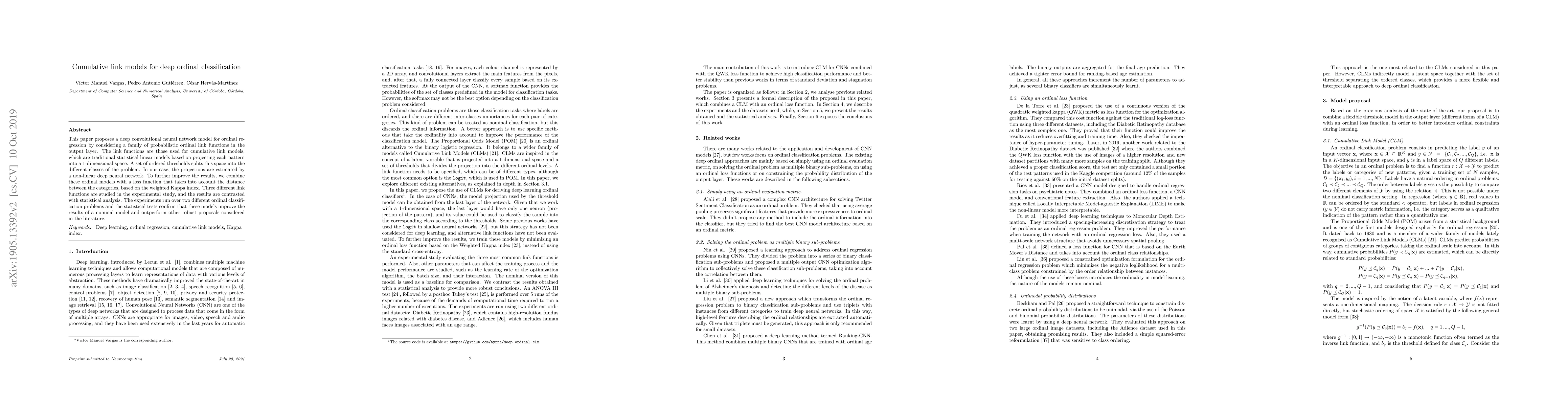 This paper proposes a deep convolutional neural network model for ordinal regression using cumulative link functions, showing improved performance over nominal models and other robust proposals through experiments on two ordinal classification problems. The model combines ordinal link functions with a weighted Kappa index-based loss function.