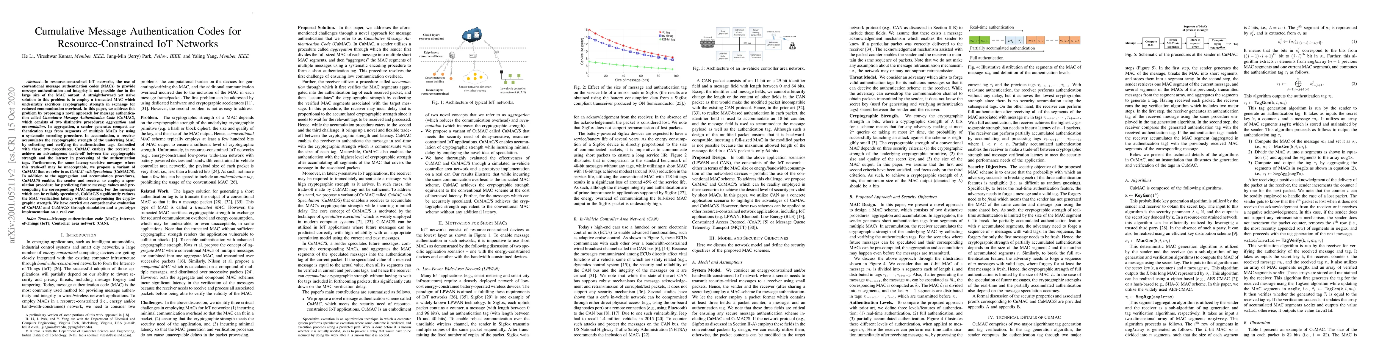In resource-constrained IoT networks, the use of conventional message authentication codes (MACs) to provide message authentication and integrity is not possible due to the large size of the MAC output. A straightforward yet naive solution to this problem is to employ a truncated MAC which undesirably sacrifices cryptographic strength in exchange for reduced communication overhead. In this paper, we address this problem by proposing a novel approach for message authentication called \textit{Cumulative Message Authentication Code} (CuMAC), which consists of two distinctive procedures: \textit{aggregation} and \textit{accumulation}. In aggregation, a sender generates compact authentication tags from segments of multiple MACs by using a systematic encoding procedure. In accumulation, a receiver accumulates the cryptographic strength of the underlying MAC by collecting and verifying the authentication tags. Embodied with these two procedures, CuMAC enables the receiver to achieve an advantageous trade-off between the cryptographic strength and the latency in processing of the authentication tags. Furthermore, for some latency-sensitive messages where this trade-off may be unacceptable, we propose a variant of CuMAC that we refer to as \textit{CuMAC with Speculation} (CuMAC/S). In addition to the aggregation and accumulation procedures, CuMAC/S enables the sender and receiver to employ a speculation procedure for predicting future message values and pre-computing the corresponding MAC segments. For the messages which can be reliably speculated, CuMAC/S significantly reduces the MAC verification latency without compromising the cryptographic strength. We have carried out comprehensive evaluation of CuMAC and CuMAC/S through simulation and a prototype implementation on a real car.