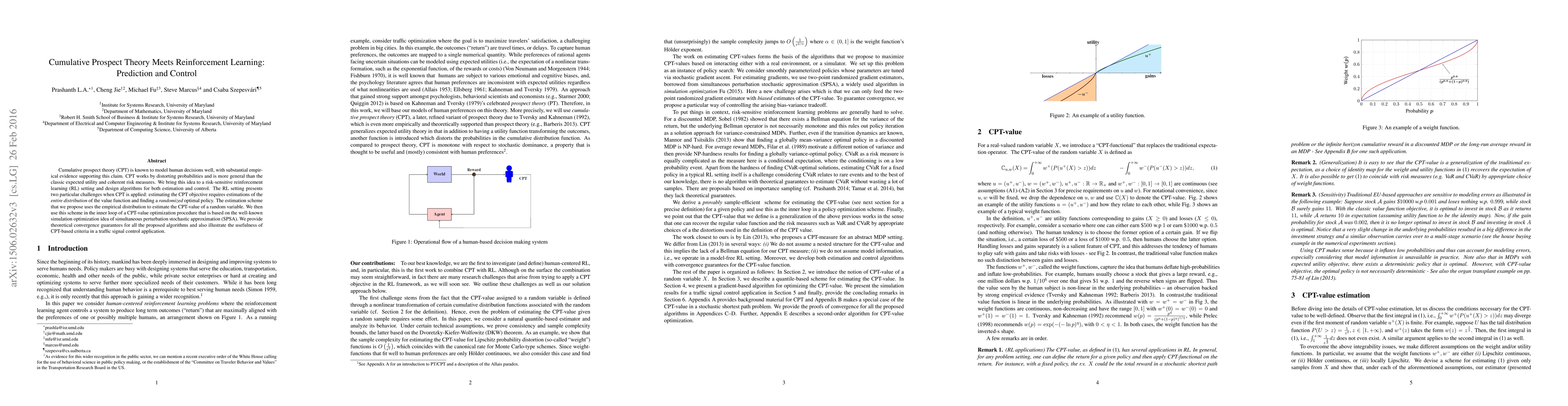 This paper integrates cumulative prospect theory (CPT) into a reinforcement learning framework to model and optimize human-like decision-making. It proposes algorithms for both estimation and control, addressing the challenges of estimating CPT objectives and finding optimal policies in RL settings, with theoretical convergence guarantees and demonstrated application in traffic signal control.