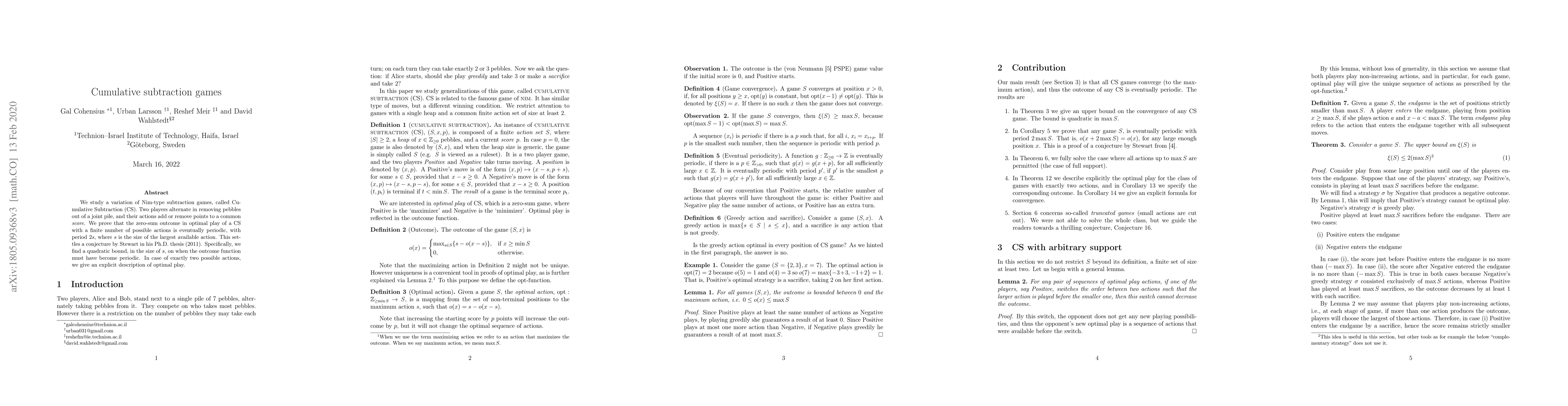 This paper explores Cumulative Subtraction (CS) games, a variant of combinatorial subtraction games, proving that their optimal play outcomes are eventually periodic with a period dependent on the size of the largest available action. The study settles a conjecture by Stewart and provides a quadratic bound on the periodicity onset.