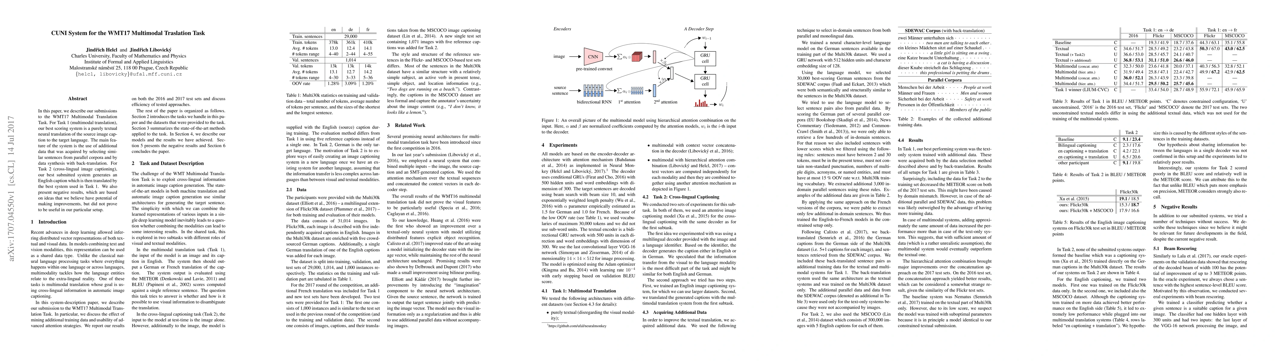 Two-line summary: The CUNI team's submissions to the WMT17 Multimodal Translation Task primarily rely on textual neural translation enhanced with additional parallel corpora and back-translation for multimodal translation, while cross-lingual image captioning involves generating English captions followed by translation. Despite exploring potential ideas, some approaches yielded no significant improvements in their setup.