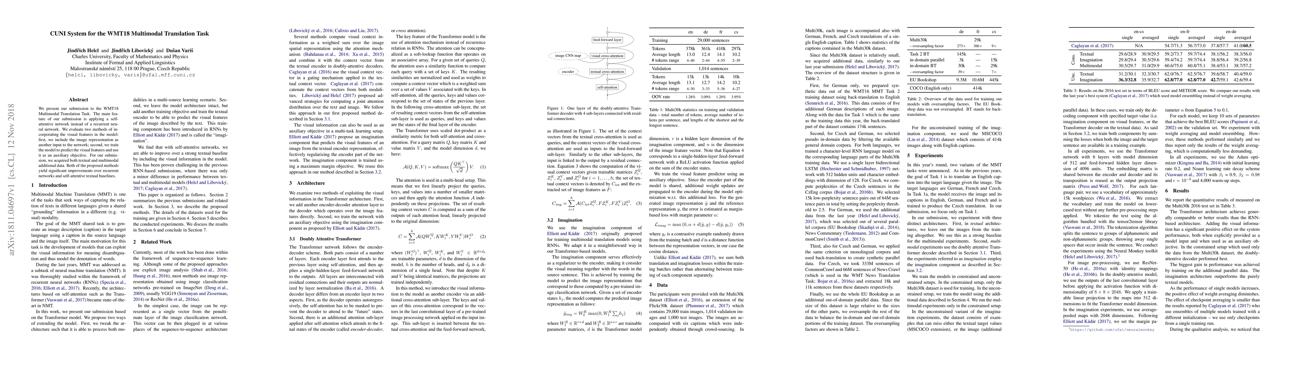 The CUNI System for the WMT18 Multimodal Translation Task utilizes a self-attentive network instead of recurrent networks, evaluating two methods for integrating visual features, which both show significant improvements over traditional and textual baselines.