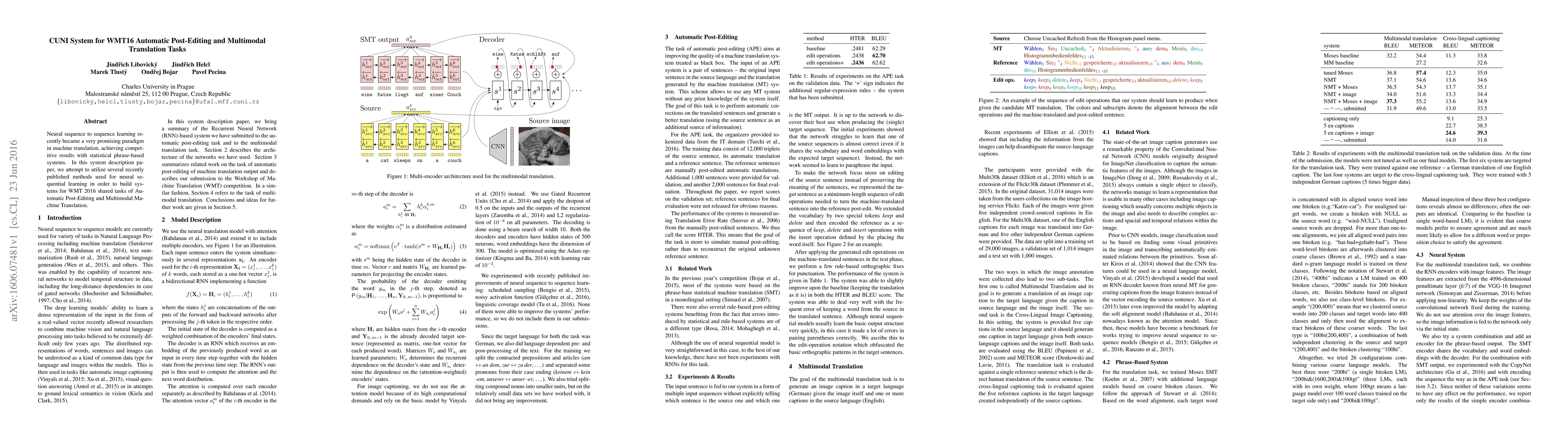 This paper describes the CUNI system for the WMT 2016 Automatic Post-Editing and Multimodal Machine Translation tasks, leveraging recent neural sequence-to-sequence learning methods to achieve competitive translation results. The system integrates various advanced neural techniques for improved translation performance.