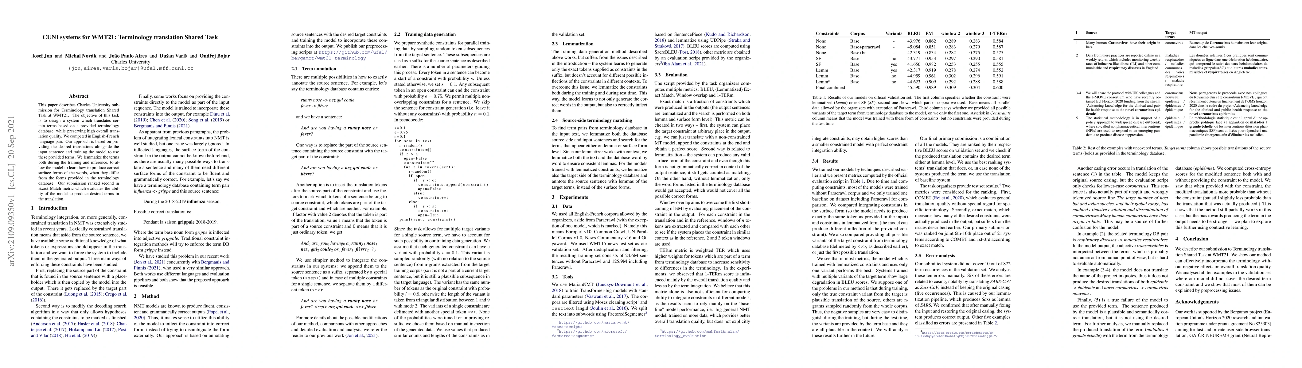 This paper details Charles University's submission for the WMT21 Terminology Translation Shared Task, focusing on translating specific terms using a provided terminology database while maintaining high translation quality. The team's approach, which includes lemmatization during training and inference, led to a second-place ranking in the Exact Match metric.