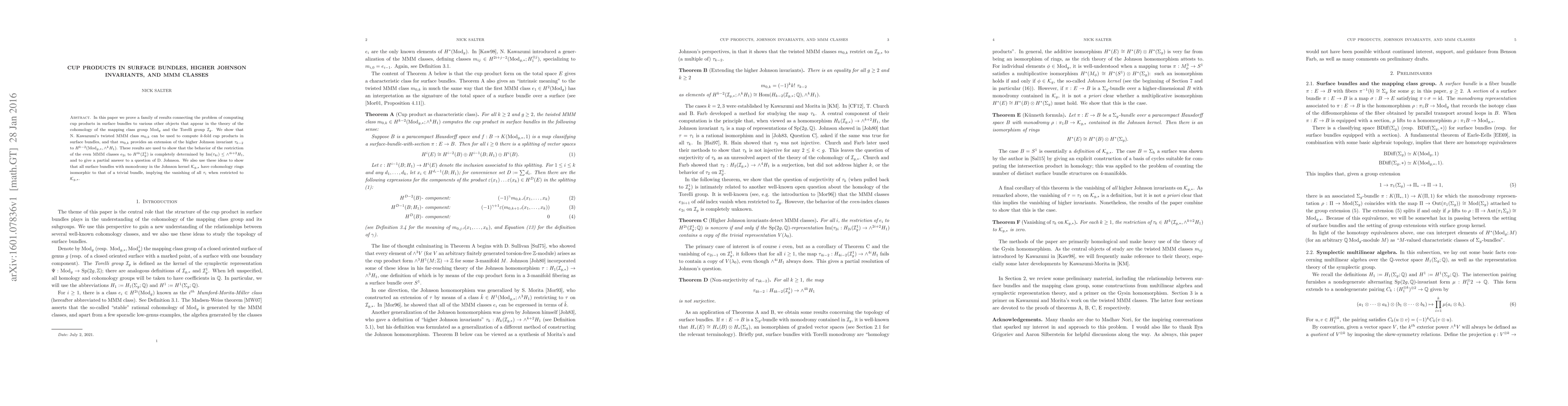 In this paper we prove a family of results connecting the problem of computing cup products in surface bundles to various other objects that appear in the theory of the cohomology of the mapping class group $\operatorname{Mod}_g$ and the Torelli group $\mathcal{I}_g$. We show that N. Kawazumi's twisted MMM class $m_{0,k}$ can be used to compute $k$-fold cup products in surface bundles, and that $m_{0,k}$ provides an extension of the higher Johnson invariant $\tau_{k-2}$ to $H^{k-2}(\operatorname{Mod}_{g,*}, \wedge^k H_1)$. These results are used to show that the behavior of the restriction of the even MMM classes $e_{2i}$ to $H^{4i}(\mathcal{I}_g^1)$ is completely determined by $\operatorname{im}(\tau_{4i}) \le \wedge^{4i+2}H_1$, and to give a partial answer to a question of D. Johnson. We also use these ideas to show that all surface bundles with monodromy in the Johnson kernel $\mathcal K_{g,*}$ have cohomology rings isomorphic to that of a trivial bundle, implying the vanishing of all $\tau_i$ when restricted to $\mathcal K_{g,*}$.