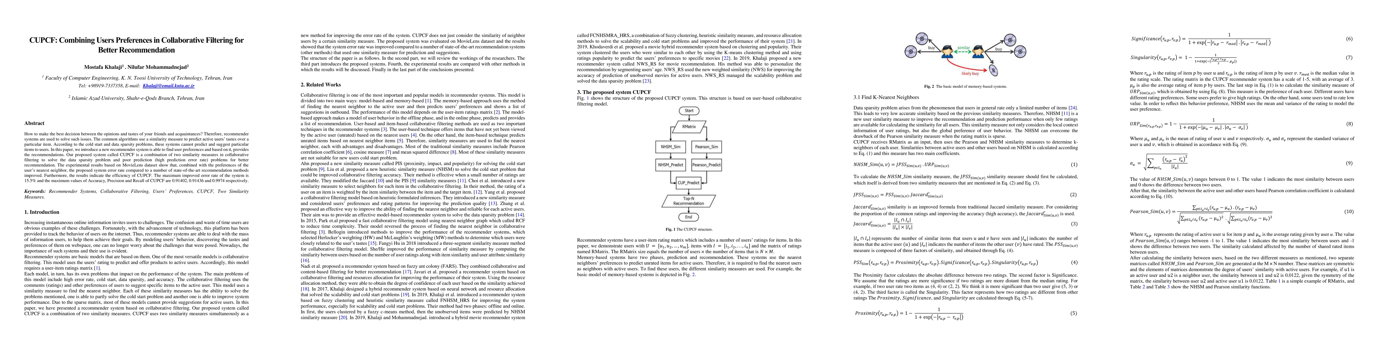 How to make the best decision between the opinions and tastes of your friends and acquaintances? Therefore, recommender systems are used to solve such issues. The common algorithms use a similarity measure to predict active users' tastes over a particular item. According to the cold start and data sparsity problems, these systems cannot predict and suggest particular items to users. In this paper, we introduce a new recommender system is able to find user preferences and based on it, provides the recommendations. Our proposed system called CUPCF is a combination of two similarity measures in collaborative filtering to solve the data sparsity problem and poor prediction (high prediction error rate) problems for better recommendation. The experimental results based on MovieLens dataset show that, combined with the preferences of the user's nearest neighbor, the proposed system error rate compared to a number of state-of-the-art recommendation methods improved. Furthermore, the results indicate the efficiency of CUPCF. The maximum improved error rate of the system is 15.5% and the maximum values of Accuracy, Precision and Recall of CUPCF are 0.91402, 0.91436 and 0.9974 respectively.