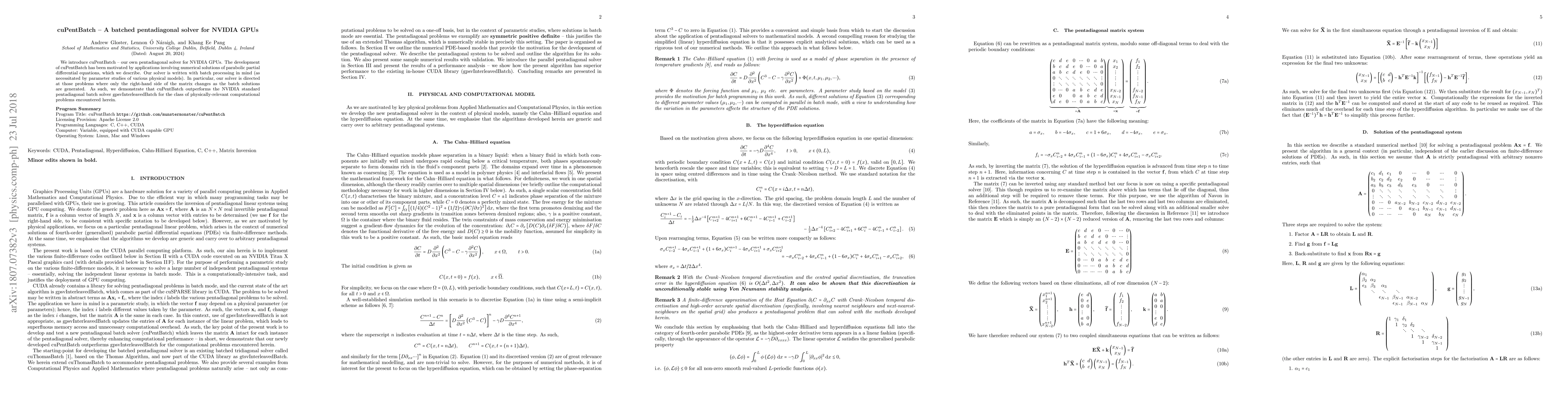 Summary: cuPentBatch is a specialized pentadiagonal solver for NVIDIA GPUs designed for batch processing in numerical simulations of parabolic partial differential equations. It outperforms the standard solver gpsvInterleavedBatch, particularly when only the right-hand side of the matrix varies across batches.