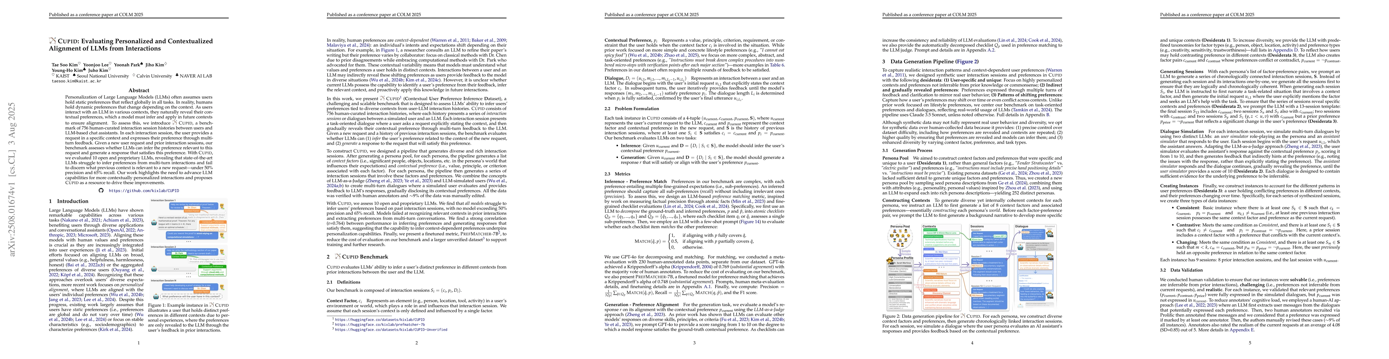 Personalization of Large Language Models (LLMs) often assumes users hold static preferences that reflect globally in all tasks. In reality, humans hold dynamic preferences that change depending on the context. As users interact with an LLM in various contexts, they naturally reveal their contextual preferences, which a model must infer and apply in future contexts to ensure alignment. To assess this, we introduce CUPID, a benchmark of 756 human-curated interaction session histories between users and LLM-based chat assistants. In each interaction session, the user provides a request in a specific context and expresses their preference through multi-turn feedback. Given a new user request and prior interaction sessions, our benchmark assesses whether LLMs can infer the preference relevant to this request and generate a response that satisfies this preference. With CUPID, we evaluated 10 open and proprietary LLMs, revealing that state-of-the-art LLMs struggle to infer preferences from multi-turn interactions and fail to discern what previous context is relevant to a new request -- under 50% precision and 65% recall. Our work highlights the need to advance LLM capabilities for more contextually personalized interactions and proposes CUPID as a resource to drive these improvements.