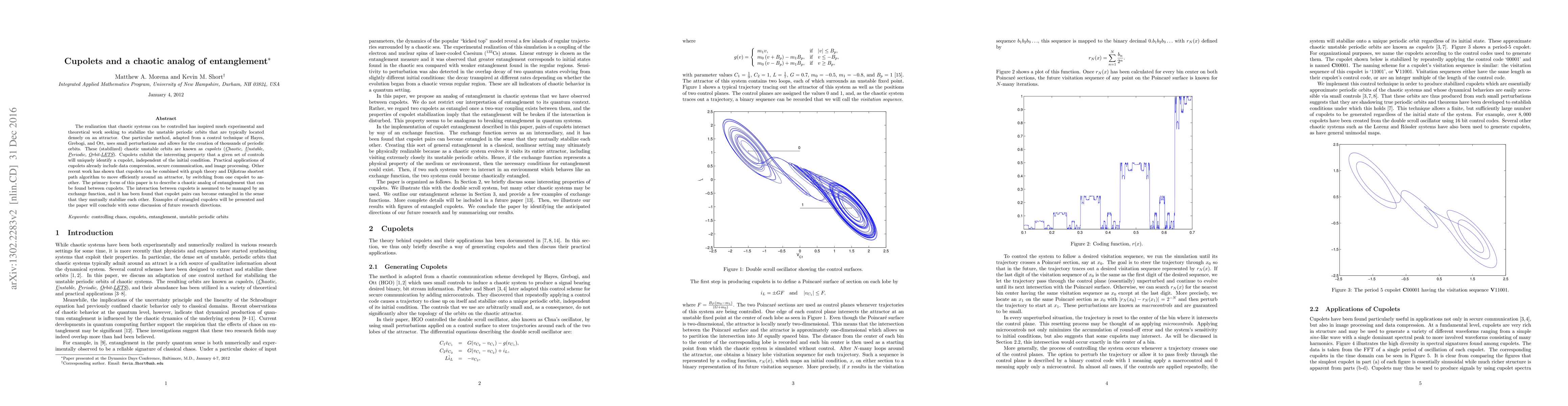 This paper discusses applications of a particular control technique that can be used to very efficiently stabilize a chaotic system onto a large subset of the unstable periodic orbits that are typically embedded in the system. The control method is adapted from one developed by Hayes, Grebogi, and Ott, and the resulting (stabilized) orbits are known as cupolets (Chaotic, Unstable, Periodic, Orbit-LETS). Cupolets exhibit the interesting property that a given set of controls will uniquely identify a cupolet, independent of its initial condition. Practical applications of cupolets already include data compression, secure communication, and image processing. We demonstrate how cupolets from two interacting chaotic systems may be induced into a state of mutual and self-sustaining stabilization, in a manner that may be an analog of quantum entanglement.