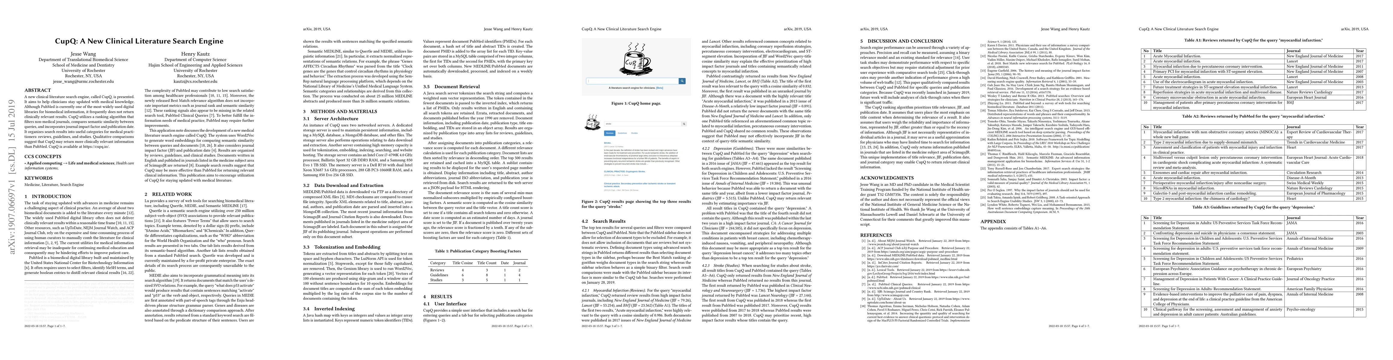 A new clinical literature search engine, called CupQ, is presented. It aims to help clinicians stay updated with medical knowledge. Although PubMed is currently one of the most widely used digital libraries for biomedical information, it frequently does not return clinically relevant results. CupQ utilizes a ranking algorithm that filters non-medical journals, compares semantic similarity between queries, and incorporates journal impact factor and publication date. It organizes search results into useful categories for medical practitioners: reviews, guidelines, and studies. Qualitative comparisons suggest that CupQ may return more clinically relevant information than PubMed. CupQ is available at https://cupq.io/.