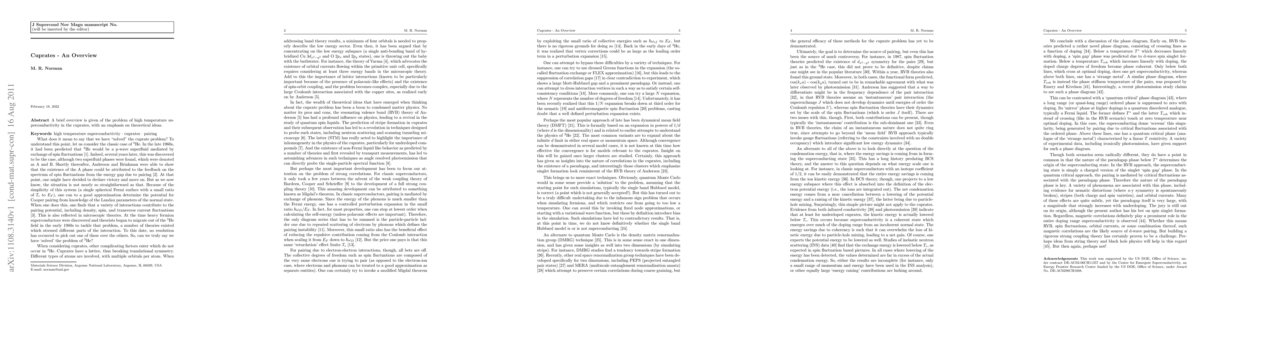 A brief overview is given of the problem of high temperature superconductivity in the cuprates, with an emphasis on theoretical ideas.