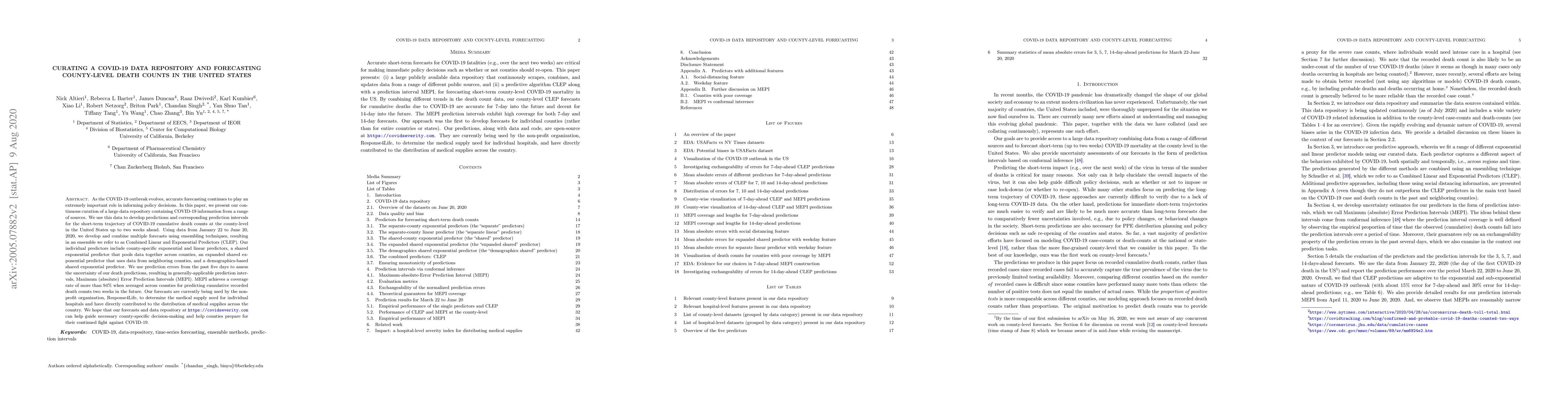 This paper curates a comprehensive COVID-19 data repository and develops ensemble forecasting models to predict county-level death counts in the U.S. up to two weeks ahead, achieving a coverage rate of over 94% for prediction intervals, and aiding non-profits in medical supply distribution.