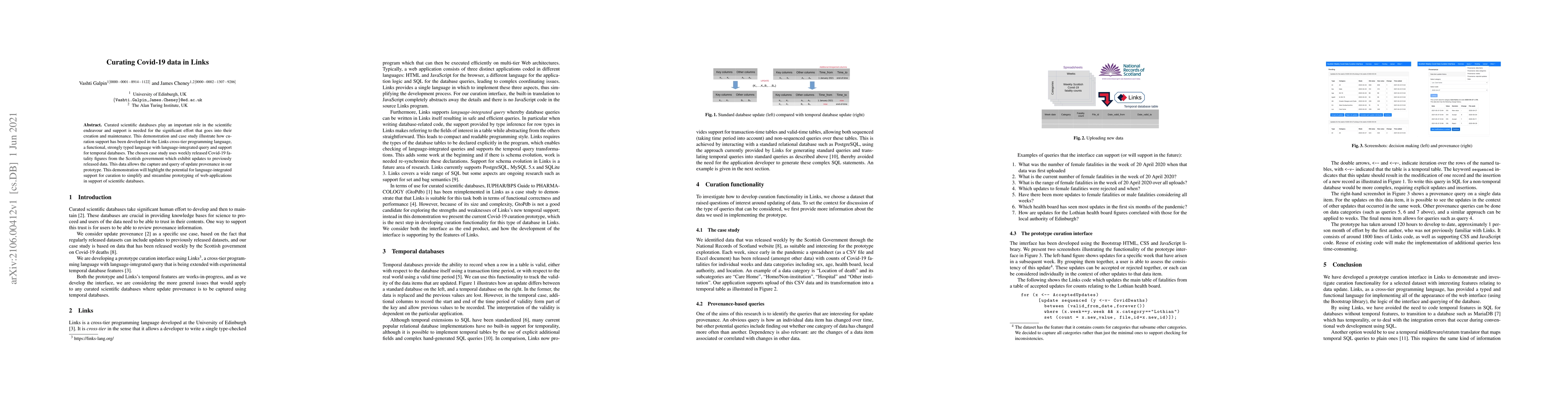 This paper demonstrates the development of curation support in the Links programming language for managing and querying updated Covid-19 fatality data from the Scottish government. The study highlights how language-integrated features can simplify the prototyping of web applications for scientific database maintenance.