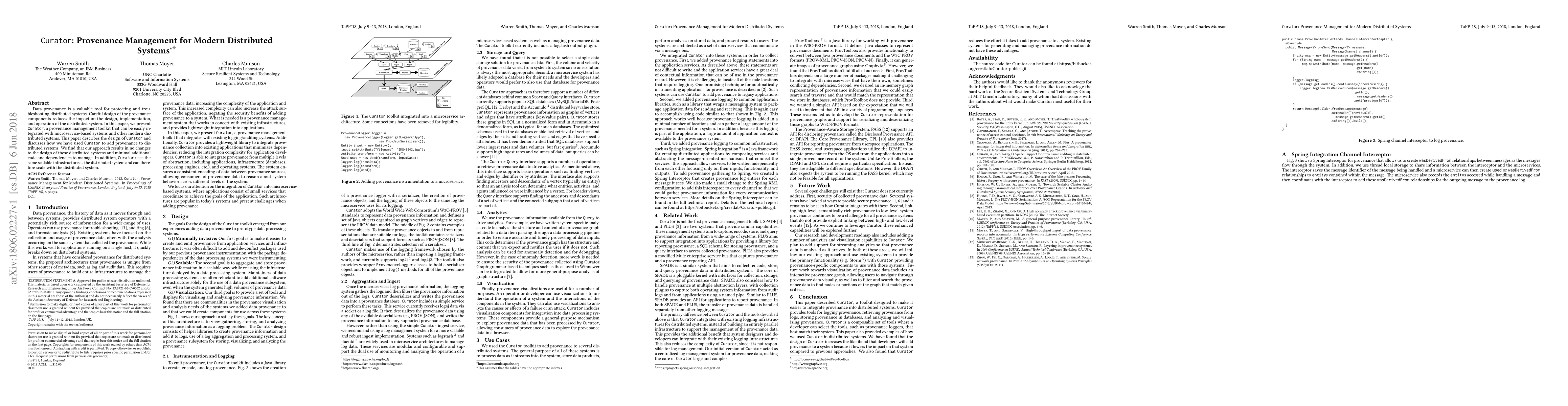 Curator is a provenance management toolkit designed to integrate seamlessly with microservice-based and other modern distributed systems. It enables scalable provenance tracking without altering the system's core design or requiring significant additional code and dependencies.