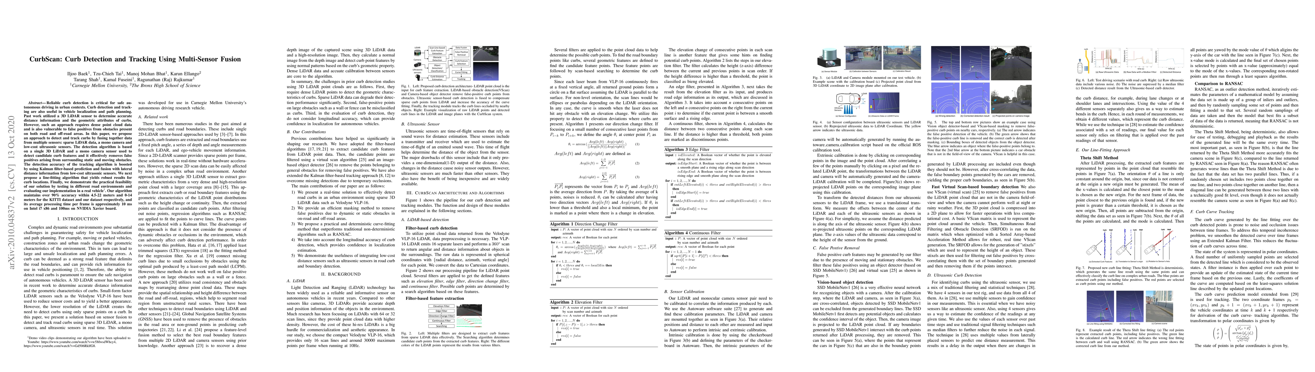 This paper proposes a curb detection and tracking method using multi-sensor fusion, combining sparse LiDAR, mono camera, and ultrasonic sensors to improve accuracy and reduce false positives. The approach achieves over 90% accuracy in various environments and processes frames in 10 ms on an Intel i7 and 100 ms on an NVIDIA Xavier board.