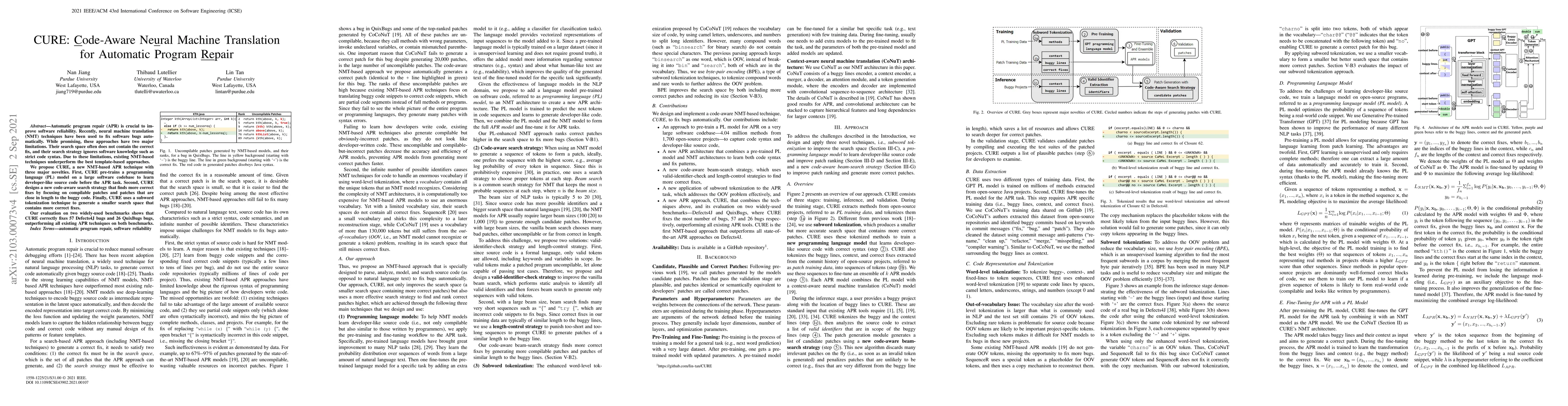 CURE introduces a code-aware neural machine translation approach for automatic program repair, pre-training on large codebases and employing a code-aware search strategy to improve fix accuracy. Evaluations demonstrate CURE outperforms existing methods in repairing bugs on two benchmarks.