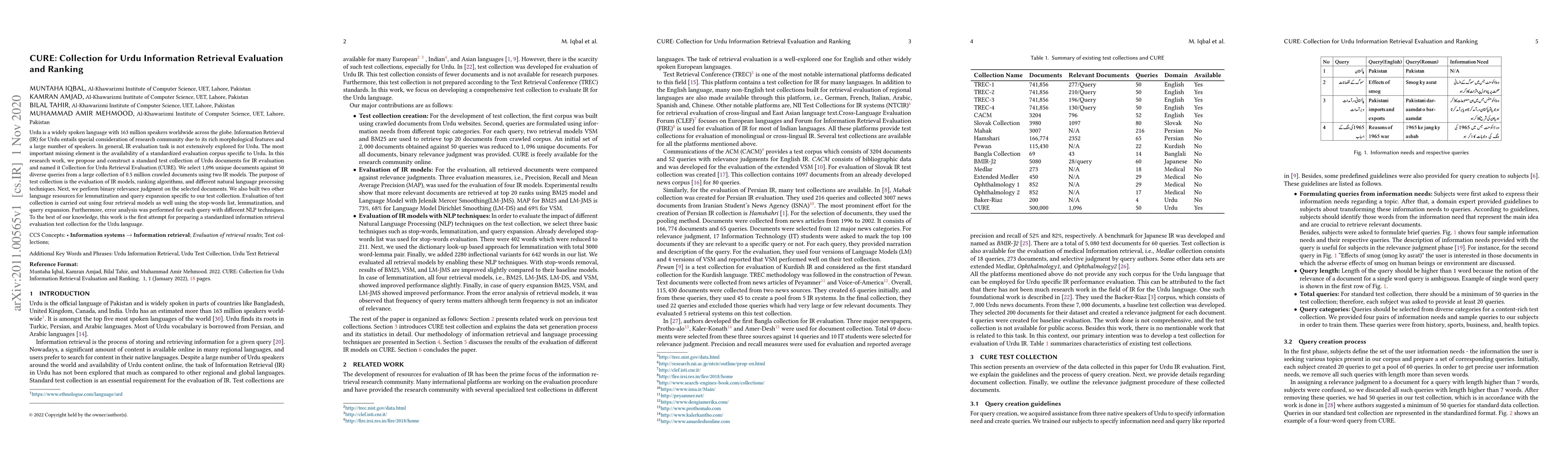 This paper introduces the CURE collection, a standardized test collection for Urdu Information Retrieval, comprising 1,096 unique documents selected from 0.5 million crawled documents to evaluate IR models and NLP techniques. The study aims to address the lack of evaluation resources for Urdu IR.