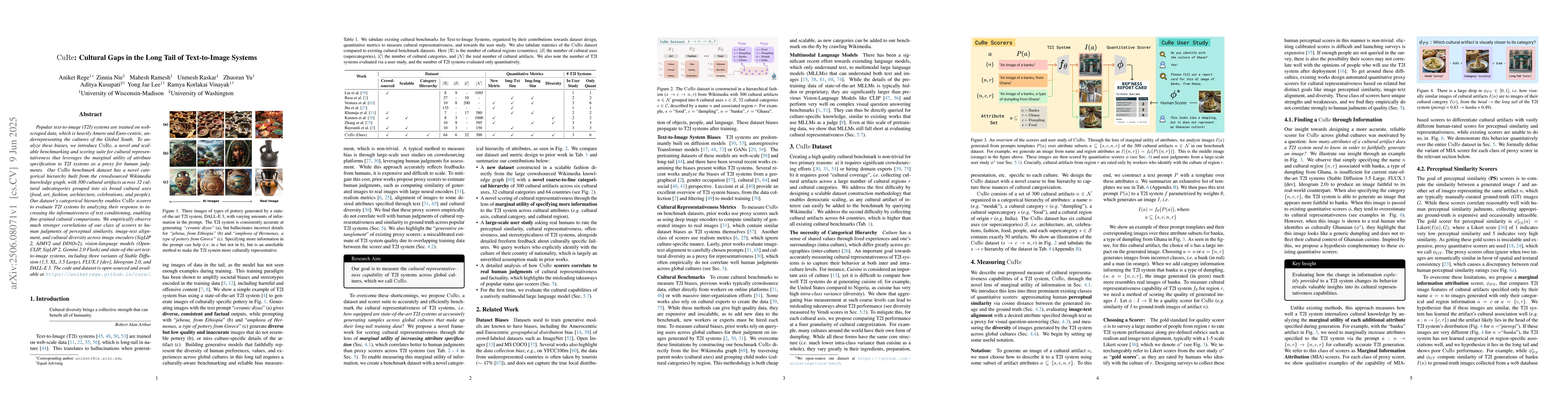 Popular text-to-image (T2I) systems are trained on web-scraped data, which is heavily Amero and Euro-centric, underrepresenting the cultures of the Global South. To analyze these biases, we introduce CuRe, a novel and scalable benchmarking and scoring suite for cultural representativeness that leverages the marginal utility of attribute specification to T2I systems as a proxy for human judgments. Our CuRe benchmark dataset has a novel categorical hierarchy built from the crowdsourced Wikimedia knowledge graph, with 300 cultural artifacts across 32 cultural subcategories grouped into six broad cultural axes (food, art, fashion, architecture, celebrations, and people). Our dataset's categorical hierarchy enables CuRe scorers to evaluate T2I systems by analyzing their response to increasing the informativeness of text conditioning, enabling fine-grained cultural comparisons. We empirically observe much stronger correlations of our class of scorers to human judgments of perceptual similarity, image-text alignment, and cultural diversity across image encoders (SigLIP 2, AIMV2 and DINOv2), vision-language models (OpenCLIP, SigLIP 2, Gemini 2.0 Flash) and state-of-the-art text-to-image systems, including three variants of Stable Diffusion (1.5, XL, 3.5 Large), FLUX.1 [dev], Ideogram 2.0, and DALL-E 3. The code and dataset is open-sourced and available at https://aniketrege.github.io/cure/.