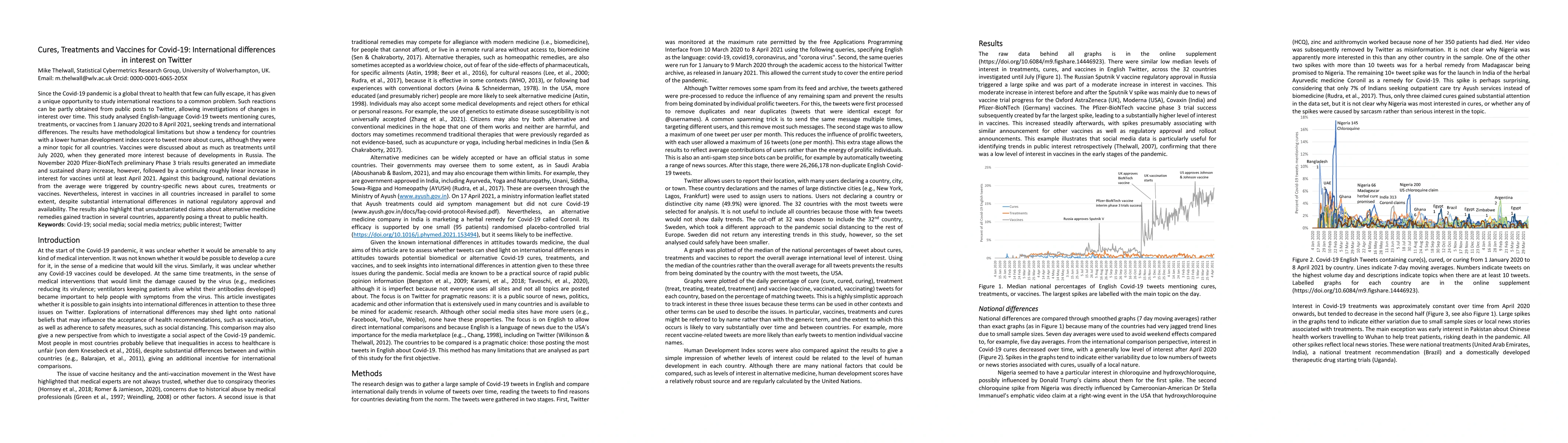 Since the Covid-19 pandemic is a global threat to health that few can fully escape, it has given a unique opportunity to study international reactions to a common problem. Such reactions can be partly obtained from public posts to Twitter, allowing investigations of changes in interest over time. This study analysed English-language Covid-19 tweets mentioning cures, treatments, or vaccines from 1 January 2020 to 8 April 2021, seeking trends and international differences. The results have methodological limitations but show a tendency for countries with a lower human development index score to tweet more about cures, although they were a minor topic for all countries. Vaccines were discussed about as much as treatments until July 2020, when they generated more interest because of developments in Russia. The November 2020 Pfizer-BioNTech preliminary Phase 3 trials results generated an immediate and sustained sharp increase, however, followed by a continuing roughly linear increase in interest for vaccines until at least April 2021. Against this background, national deviations from the average were triggered by country-specific news about cures, treatments or vaccines. Nevertheless, interest in vaccines in all countries increased in parallel to some extent, despite substantial international differences in national regulatory approval and availability. The results also highlight that unsubstantiated claims about alternative medicine remedies gained traction in several countries, apparently posing a threat to public health.