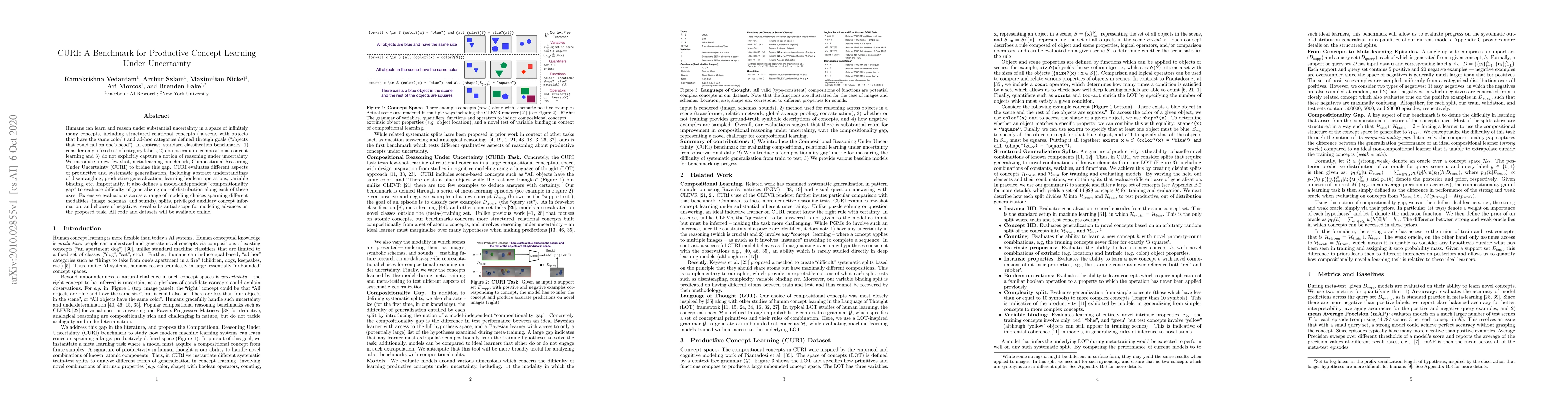 Humans can learn and reason under substantial uncertainty in a space of infinitely many concepts, including structured relational concepts ("a scene with objects that have the same color") and ad-hoc categories defined through goals ("objects that could fall on one's head"). In contrast, standard classification benchmarks: 1) consider only a fixed set of category labels, 2) do not evaluate compositional concept learning and 3) do not explicitly capture a notion of reasoning under uncertainty. We introduce a new few-shot, meta-learning benchmark, Compositional Reasoning Under Uncertainty (CURI) to bridge this gap. CURI evaluates different aspects of productive and systematic generalization, including abstract understandings of disentangling, productive generalization, learning boolean operations, variable binding, etc. Importantly, it also defines a model-independent "compositionality gap" to evaluate the difficulty of generalizing out-of-distribution along each of these axes. Extensive evaluations across a range of modeling choices spanning different modalities (image, schemas, and sounds), splits, privileged auxiliary concept information, and choices of negatives reveal substantial scope for modeling advances on the proposed task. All code and datasets will be available online.