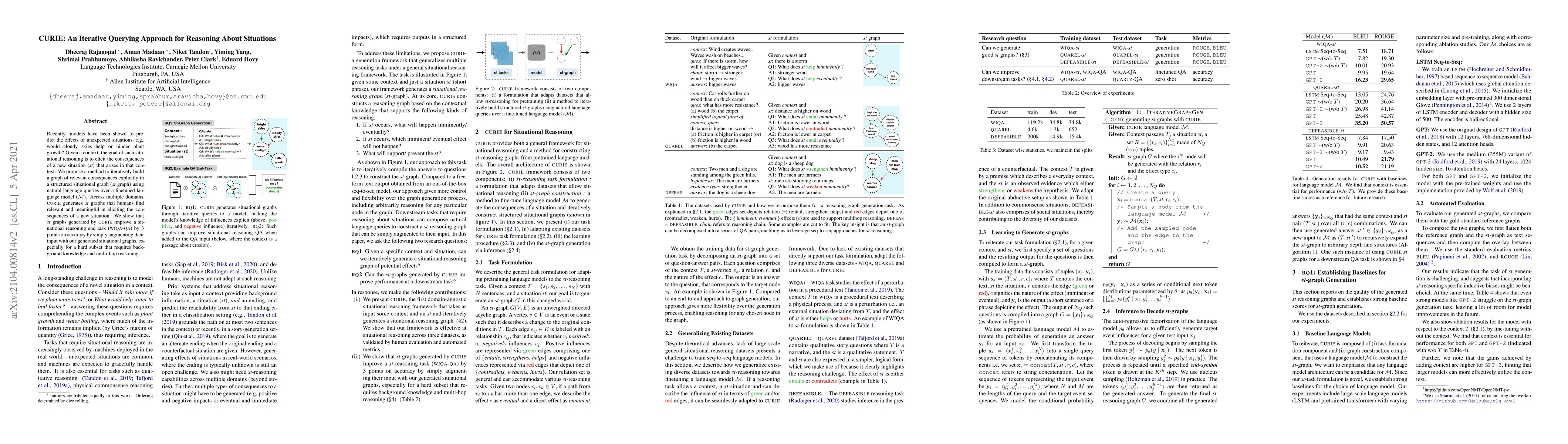 Recently, models have been shown to predict the effects of unexpected situations, e.g., would cloudy skies help or hinder plant growth? Given a context, the goal of such situational reasoning is to elicit the consequences of a new situation (st) that arises in that context. We propose a method to iteratively build a graph of relevant consequences explicitly in a structured situational graph (st-graph) using natural language queries over a finetuned language model (M). Across multiple domains, CURIE generates st-graphs that humans find relevant and meaningful in eliciting the consequences of a new situation. We show that st-graphs generated by CURIE improve a situational reasoning end task (WIQA-QA) by 3 points on accuracy by simply augmenting their input with our generated situational graphs, especially for a hard subset that requires background knowledge and multi-hop reasoning.