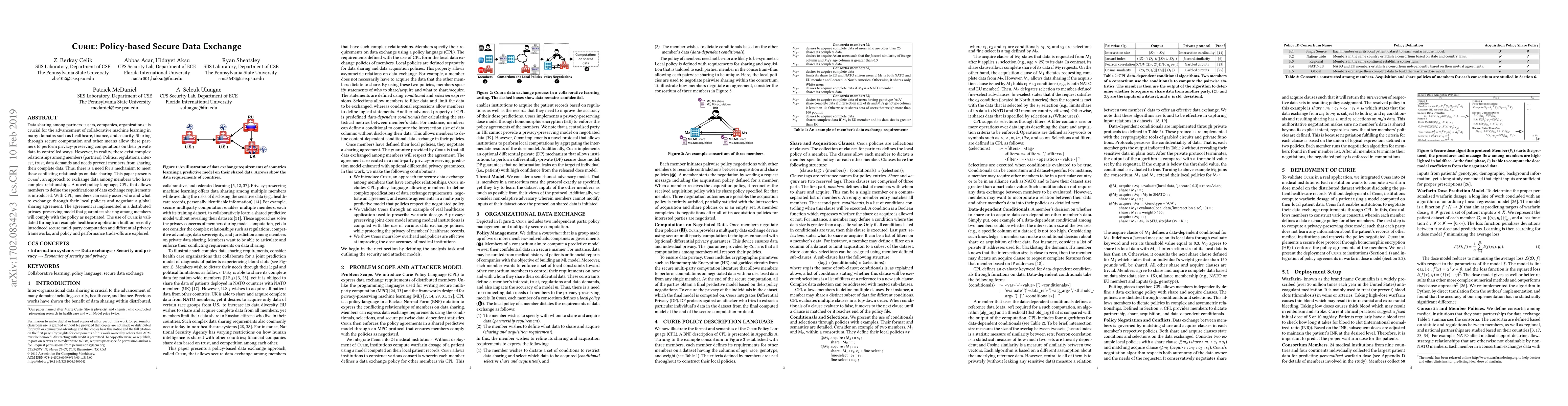Curie introduces a policy-based approach to secure data exchange among members with complex relationships, using a CPL policy language for negotiation and a multi-party computation framework for implementation.