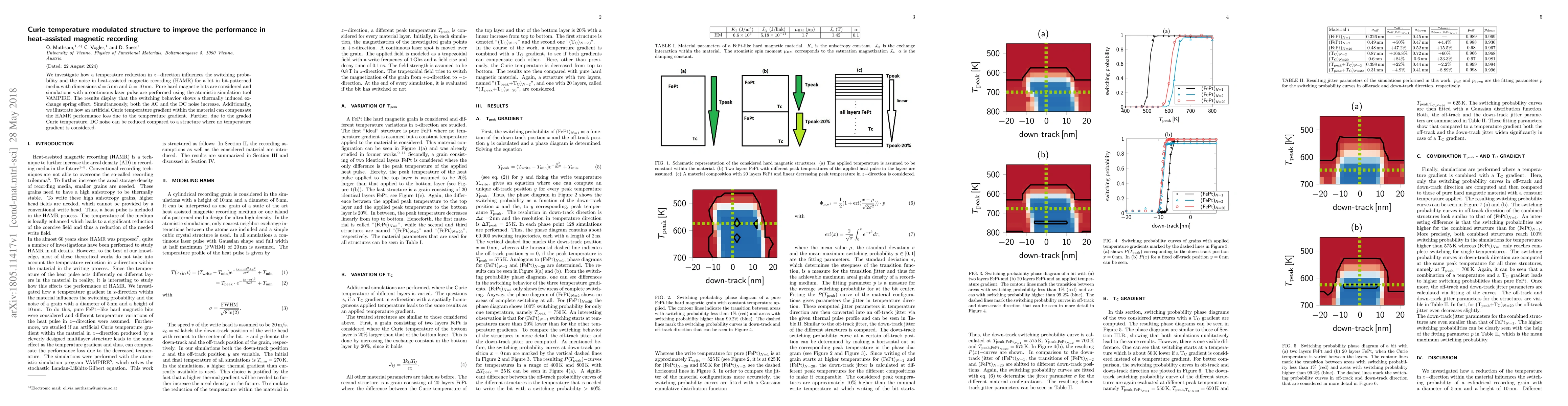 This research explores how reducing temperature in the z-direction affects switching probability and noise in heat-assisted magnetic recording (HAMR), finding an exchange spring effect. An artificial Curie temperature gradient within the material mitigates performance loss and reduces DC noise.