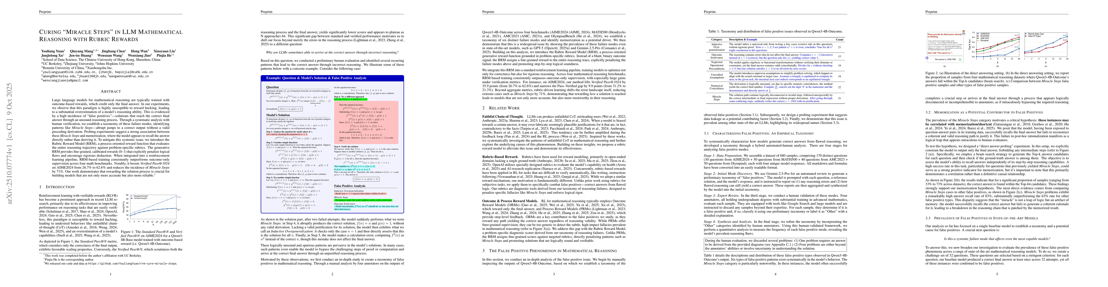 Large language models for mathematical reasoning are typically trained with outcome-based rewards, which credit only the final answer. In our experiments, we observe that this paradigm is highly susceptible to reward hacking, leading to a substantial overestimation of a model's reasoning ability. This is evidenced by a high incidence of false positives - solutions that reach the correct final answer through an unsound reasoning process. Through a systematic analysis with human verification, we establish a taxonomy of these failure modes, identifying patterns like Miracle Steps - abrupt jumps to a correct output without a valid preceding derivation. Probing experiments suggest a strong association between these Miracle Steps and memorization, where the model appears to recall the answer directly rather than deriving it. To mitigate this systemic issue, we introduce the Rubric Reward Model (RRM), a process-oriented reward function that evaluates the entire reasoning trajectory against problem-specific rubrics. The generative RRM provides fine-grained, calibrated rewards (0-1) that explicitly penalize logical flaws and encourage rigorous deduction. When integrated into a reinforcement learning pipeline, RRM-based training consistently outperforms outcome-only supervision across four math benchmarks. Notably, it boosts Verified Pass@1024 on AIME2024 from 26.7% to 62.6% and reduces the incidence of Miracle Steps by 71%. Our work demonstrates that rewarding the solution process is crucial for building models that are not only more accurate but also more reliable.