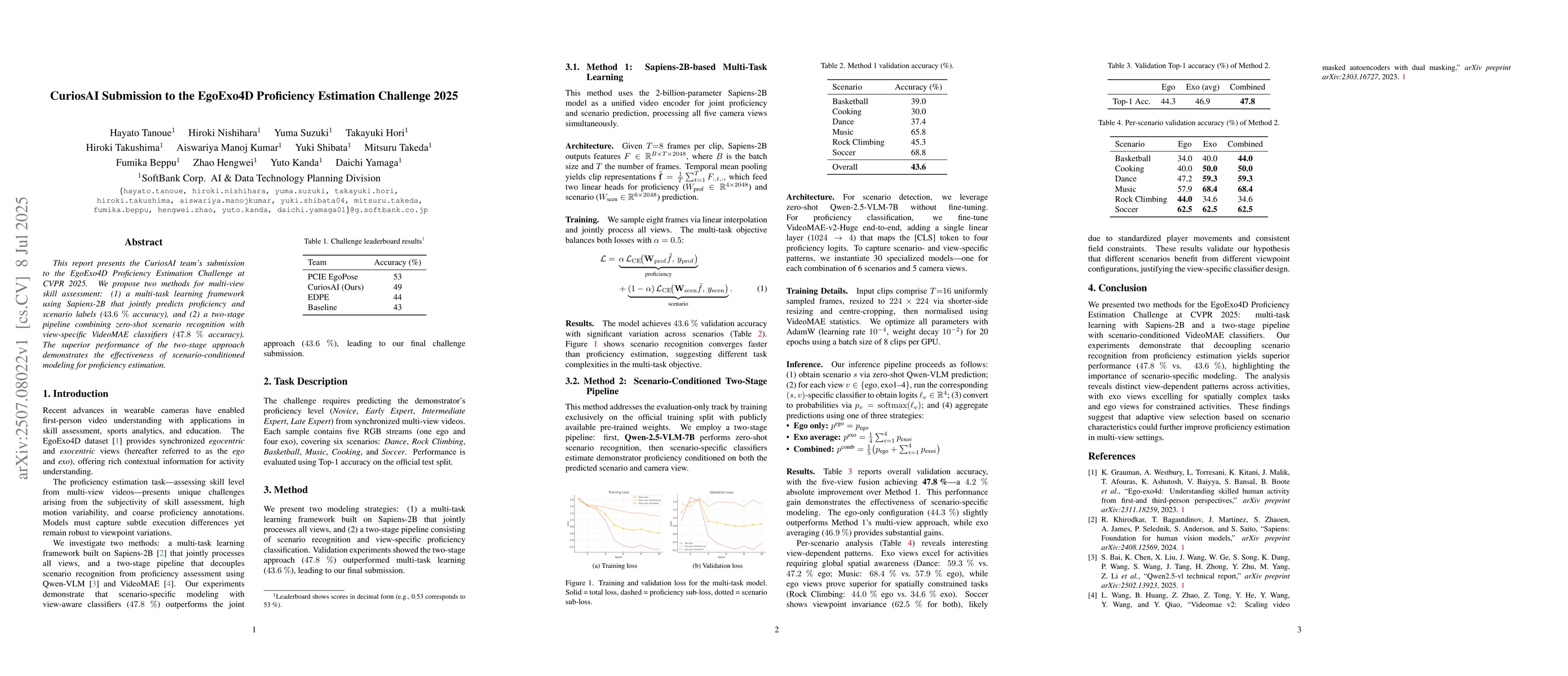 This report presents the CuriosAI team's submission to the EgoExo4D Proficiency Estimation Challenge at CVPR 2025. We propose two methods for multi-view skill assessment: (1) a multi-task learning framework using Sapiens-2B that jointly predicts proficiency and scenario labels (43.6 % accuracy), and (2) a two-stage pipeline combining zero-shot scenario recognition with view-specific VideoMAE classifiers (47.8 % accuracy). The superior performance of the two-stage approach demonstrates the effectiveness of scenario-conditioned modeling for proficiency estimation.